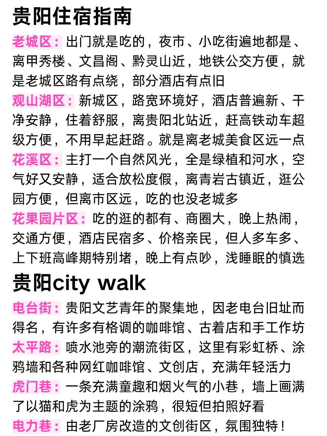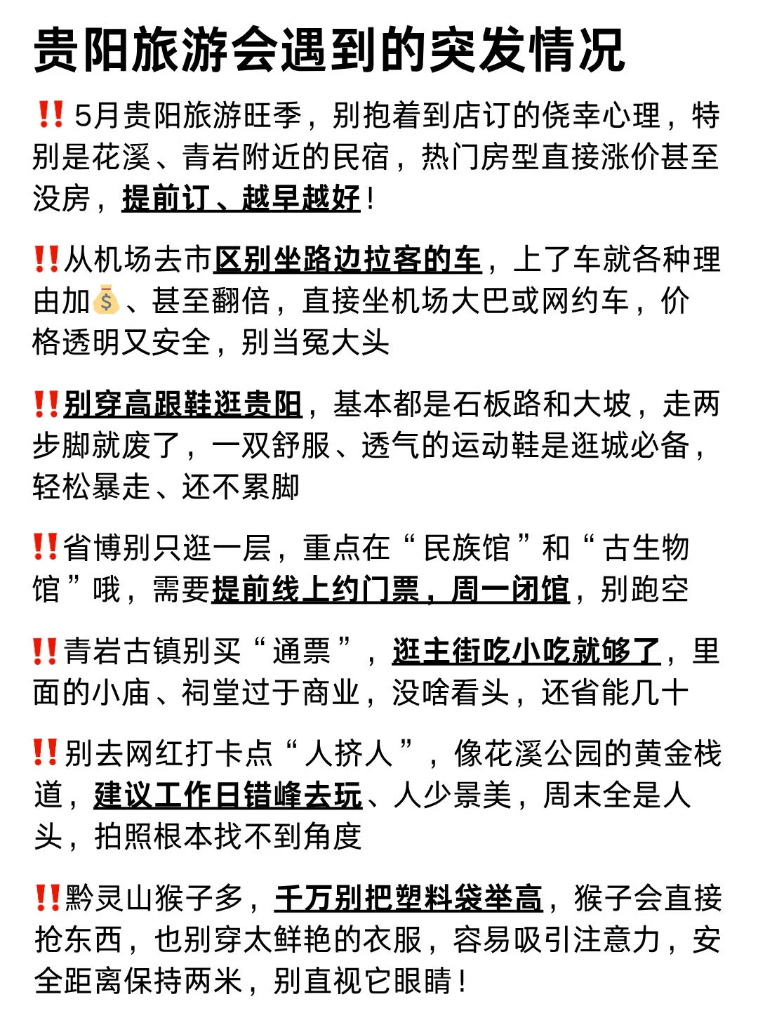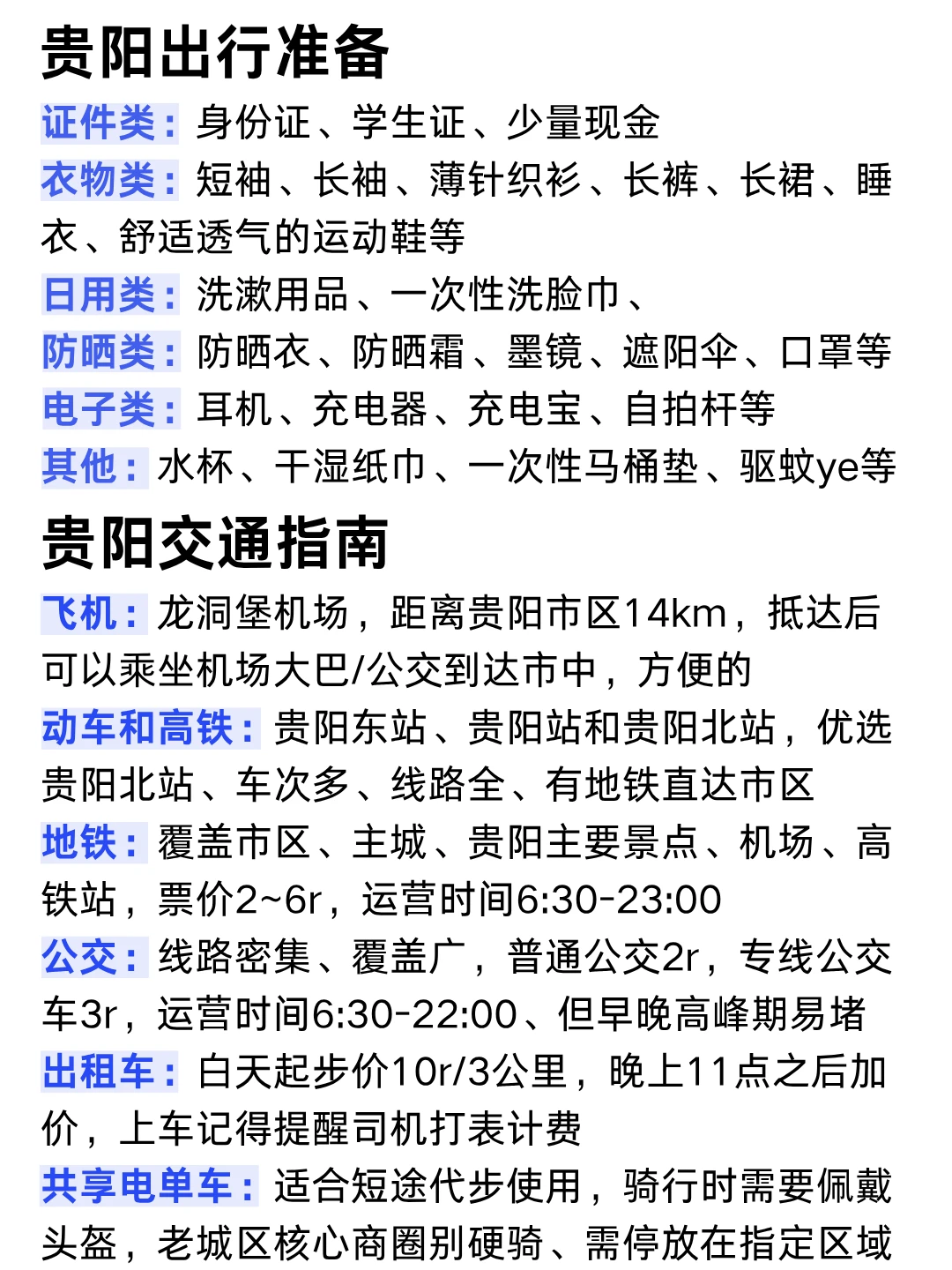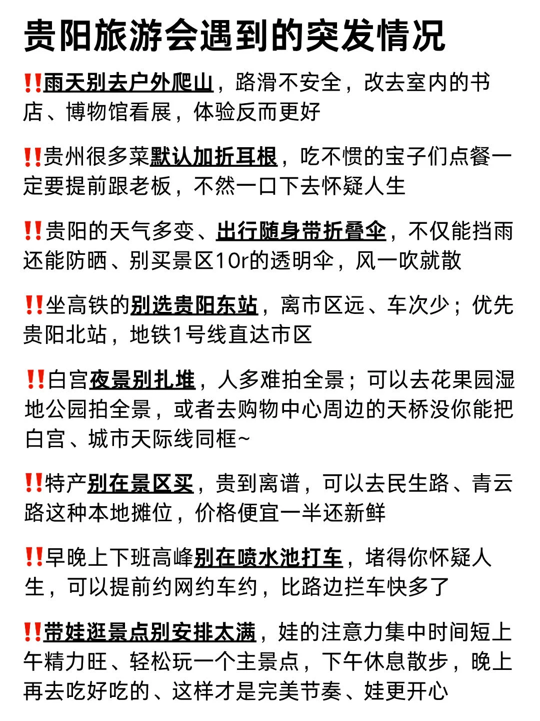 🚇贵阳交通:高铁站机场别搭黑车,认准打表出租/平台打车;贵阳山路多、易堵车,景点间多预留点时间,优先选择地铁稳当;地下通道像迷宫,认准路标,别盲目跟着导航走。