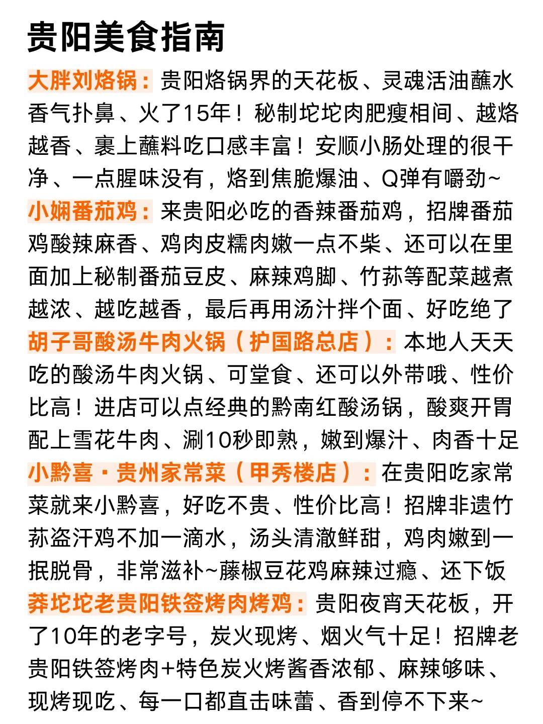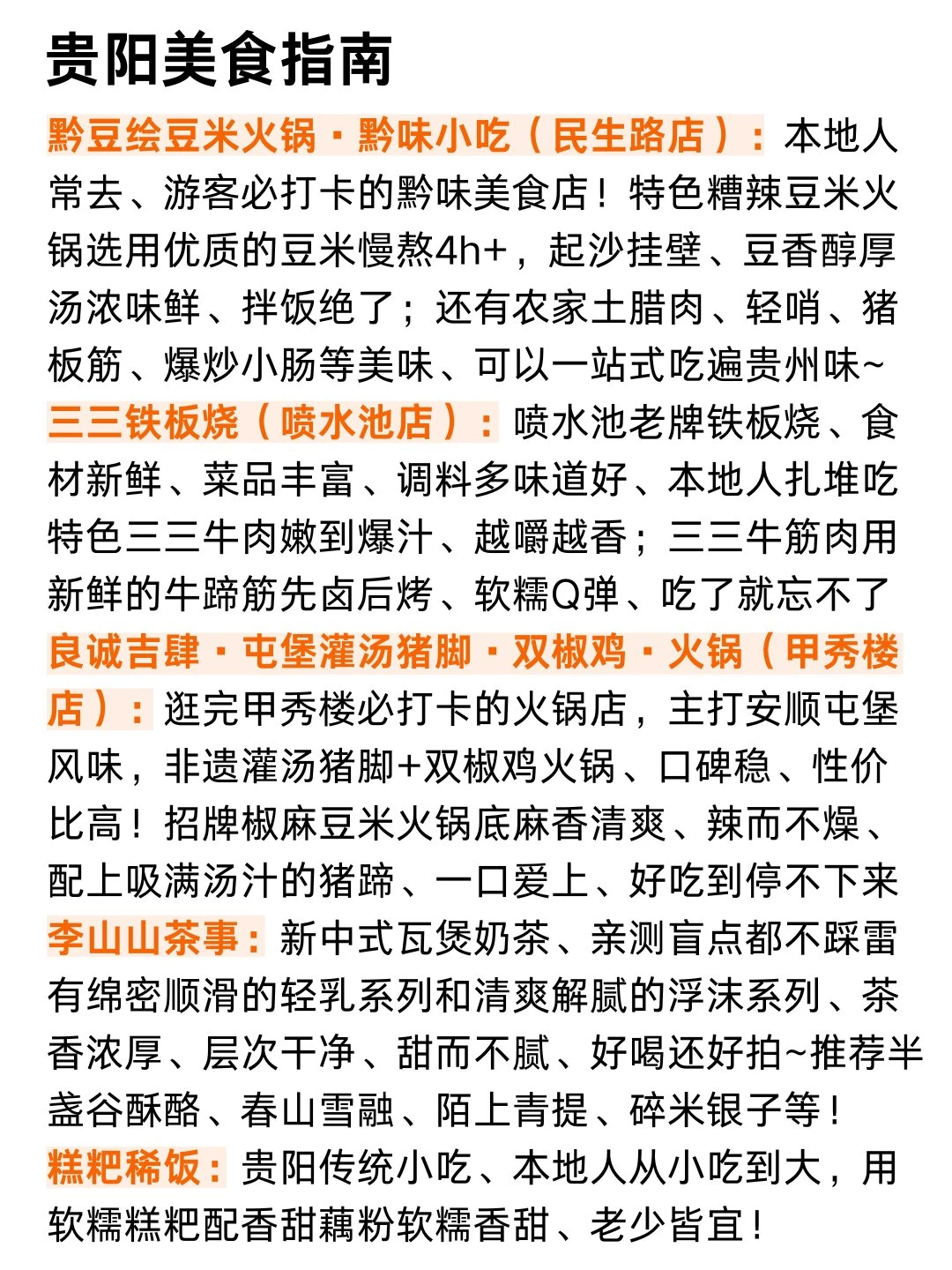 🥢贵阳美食:贵阳好吃的很多、但不建议去景区门口、网红店吃,可以去本地人常吃的美食店吃、味道正宗、价格还不贵;如大胖刘烙锅、小娴番茄鸡、胡子哥酸汤牛肉火锅(护国路总店)、小黔喜·贵州家常菜(甲秀楼店)、莽坨坨老贵阳铁签烤肉烤鸡、黔豆绘豆米火锅·黔味小吃(民生路店)、三三铁板烧(喷水池店)、良诚吉肆·屯堡灌汤猪脚·双椒鸡·火锅(甲秀楼店)、李山山茶事!