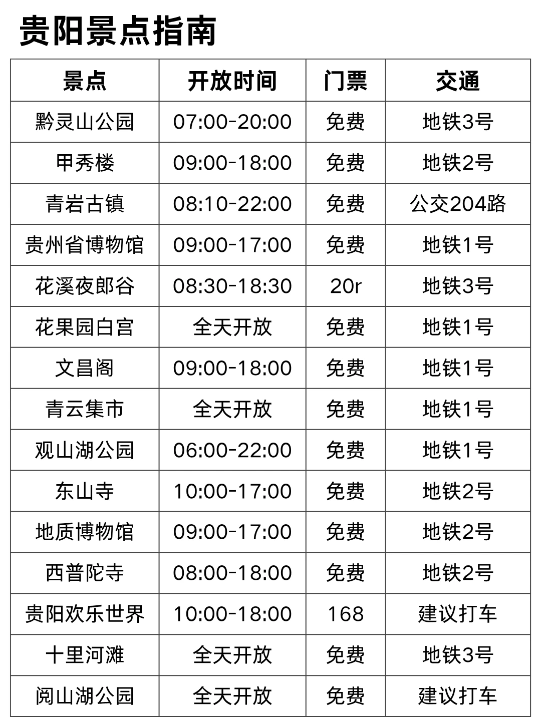 🎫门票预约:省博、热门场馆周一闭馆,务必提前预约;青岩古镇不必买通票,按需选景点即可;没预约的别硬冲,灵活改变行程