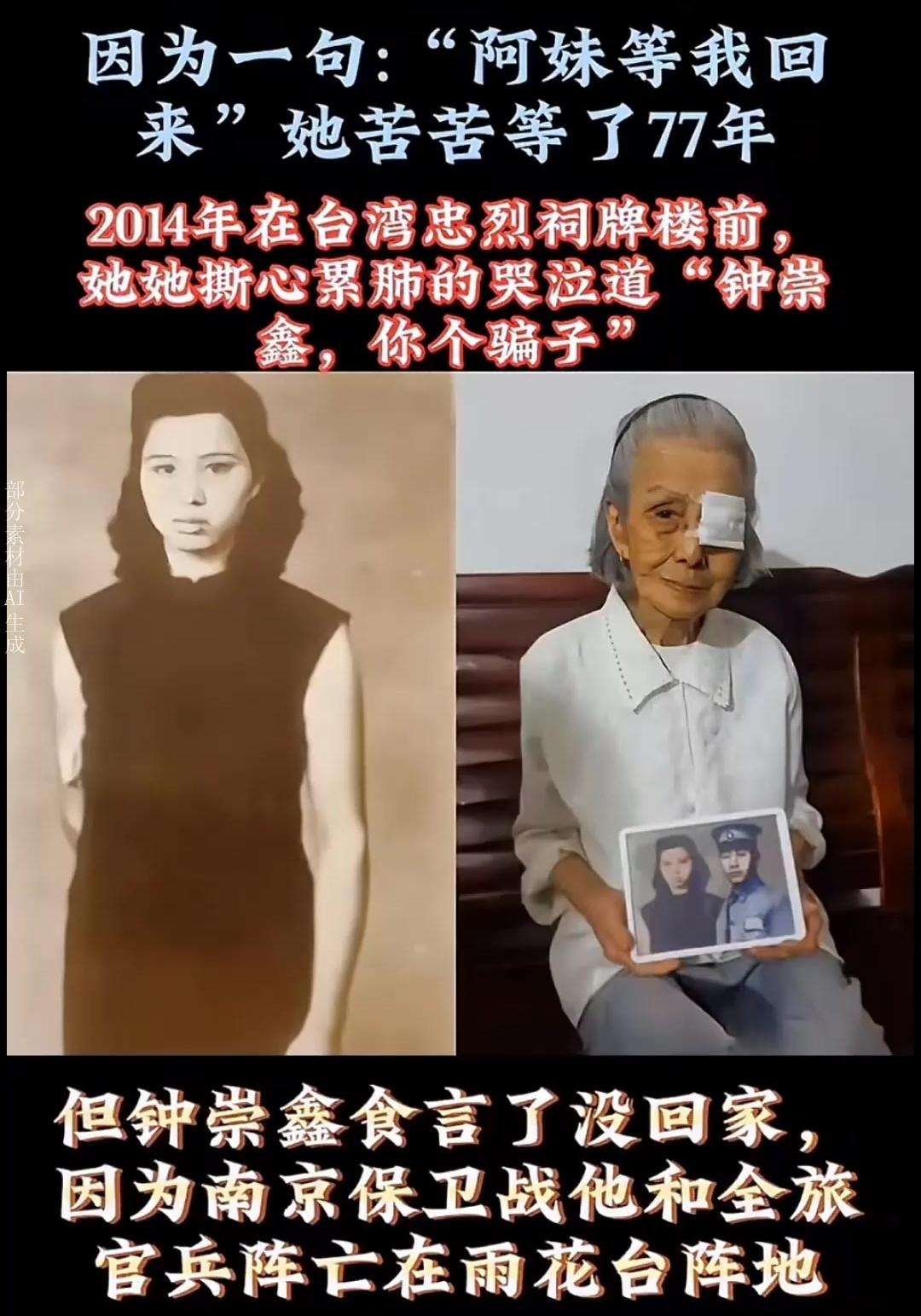 直到2014年,在志愿者的帮助下,93岁的张淑英得知钟崇鑫的灵位供奉于台北的忠烈祠,93岁高龄的她亲自前往祭奠,完成了跨越77年的“重逢”。