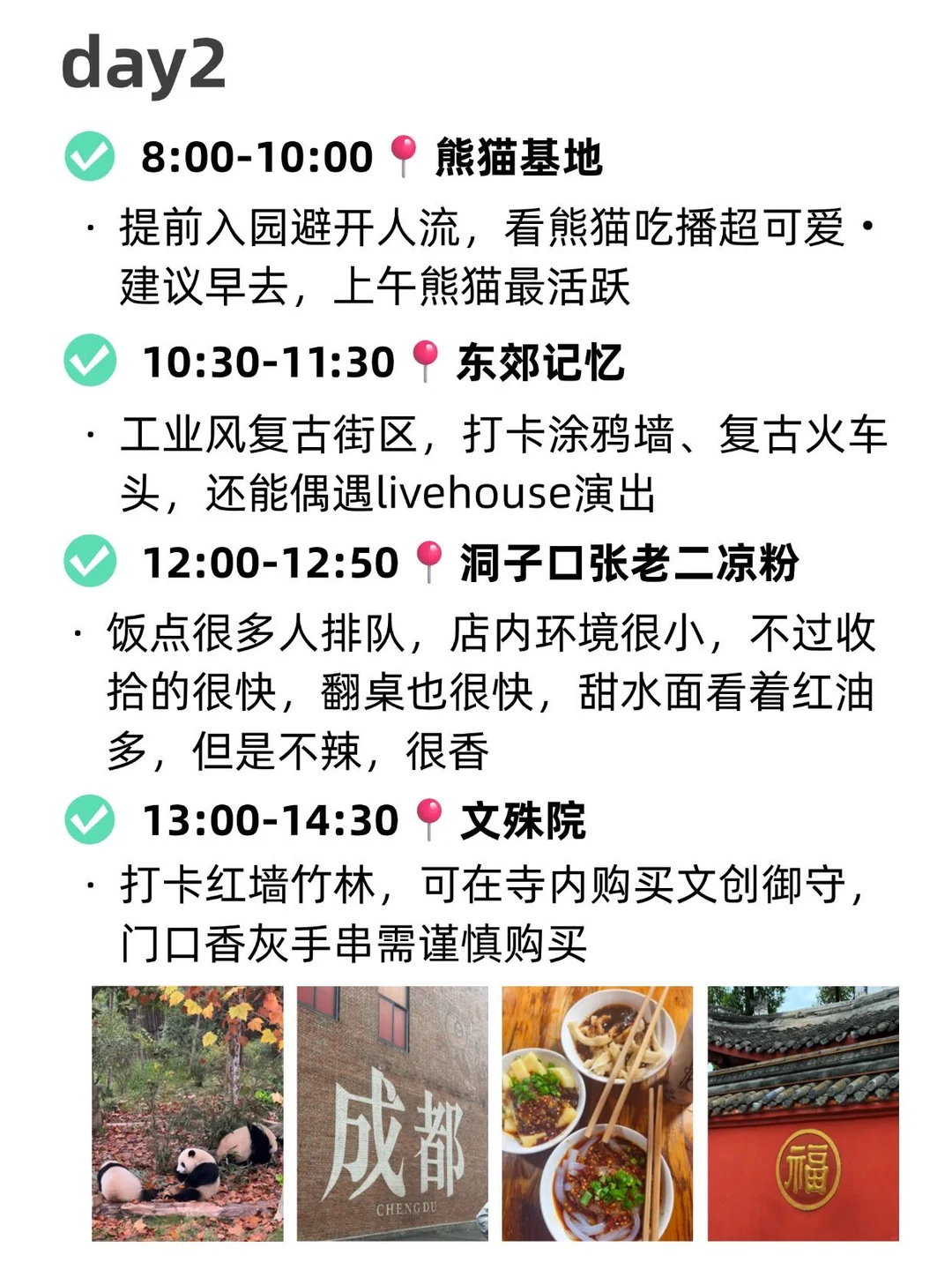 DAY2: 熊猫基地→东郊记忆→洞子口张老二凉粉→文殊院→人民公园→宽窄巷子→奎星楼街→于屿城火锅