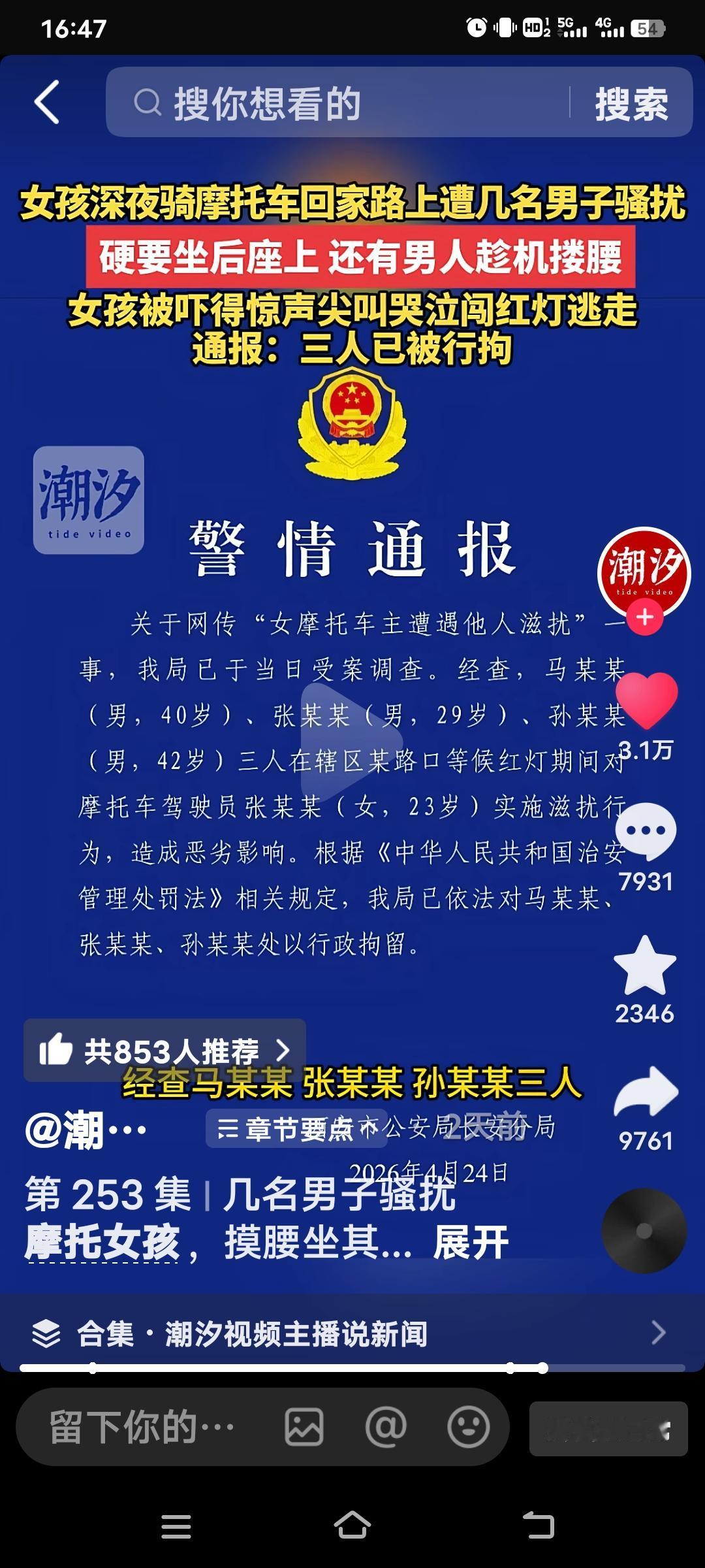 西安三名男子骚扰一名女孩的视频引发广泛关注。4月24日,长安分局发布警情通报,40岁的马某某、29岁的张某某和42岁的孙某某,被刑拘。他们竟在等红灯时骚扰一位23岁的女摩托车主。
