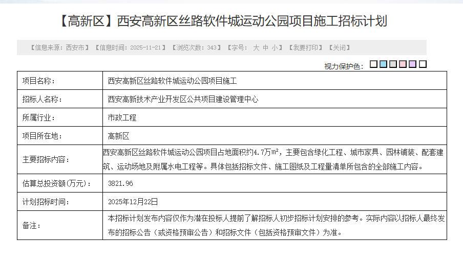 2025年11月下旬,西安高新丝路运动公园项目发布施工招标计划,本以为酝酿3年之久的项目终于要落地。