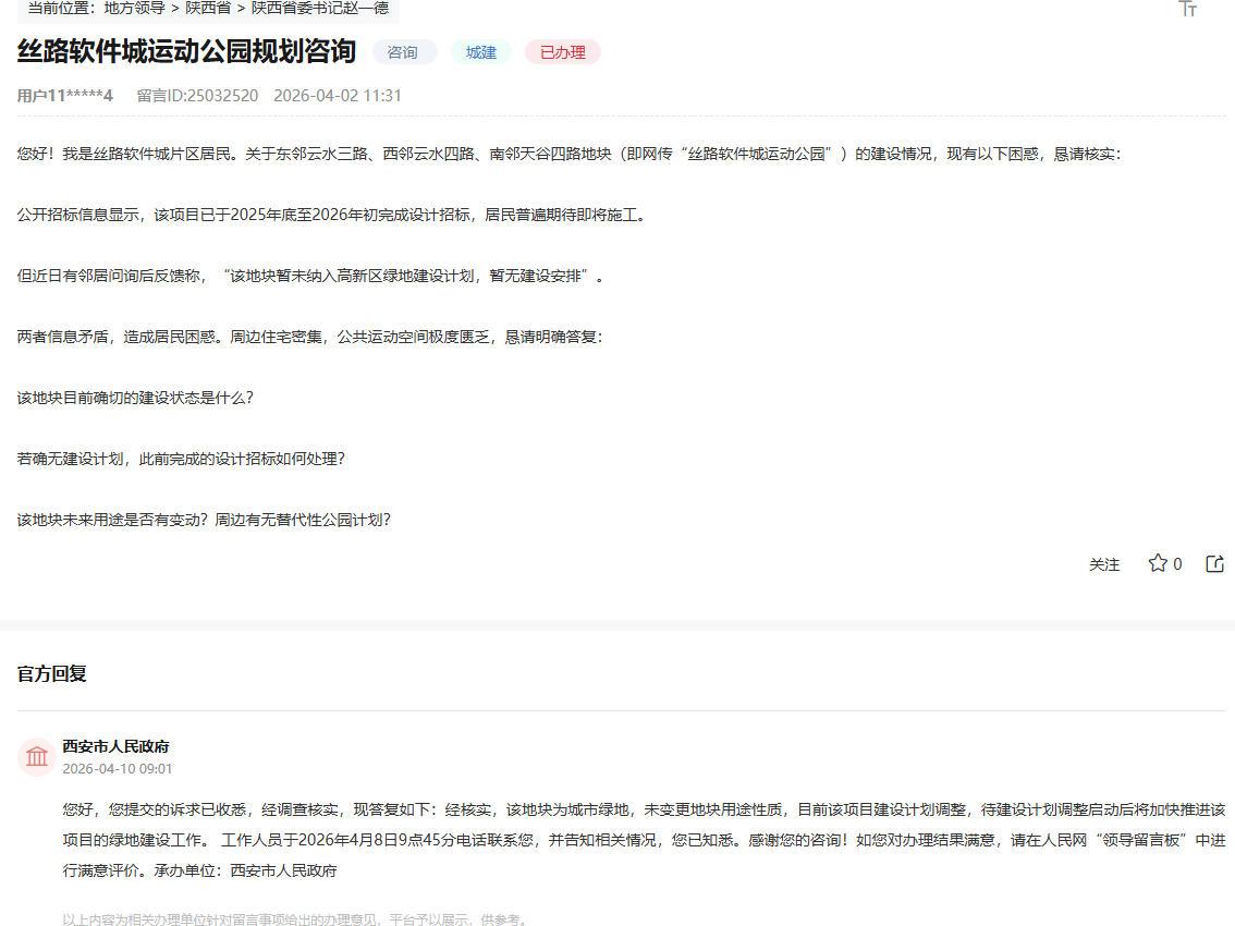 但到了2026年项目建设又有变动,根据官方最新回应,该地块为城市绿地,未变更地块用途性质,目前该项目建设计划调整,待建设计划调整启动后将加快推进该项目的绿地建设工作。