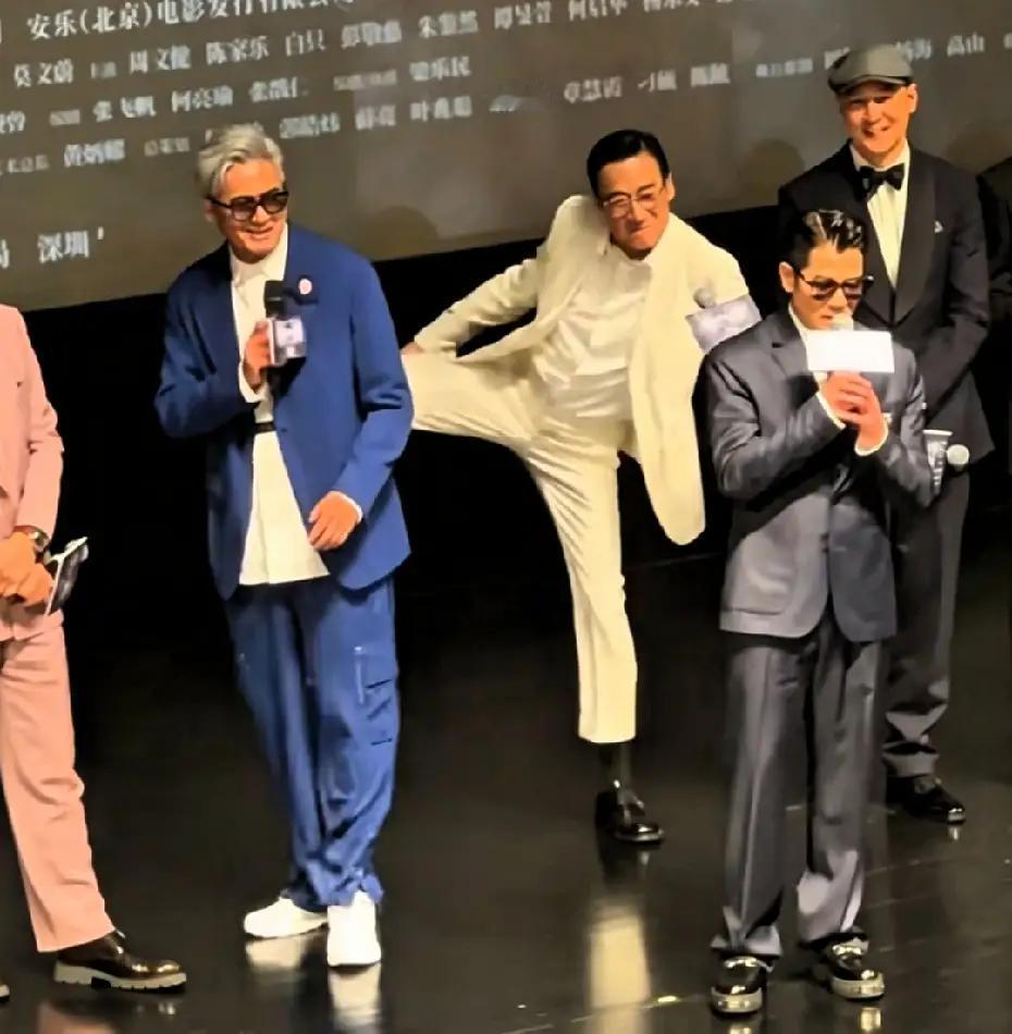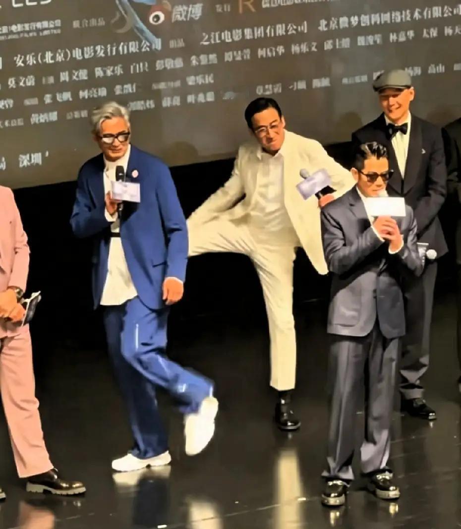 郭富城发言时,周润发偷偷在身后模仿他的舞蹈动作,还拉着梁家辉一起玩,完全没有巨星架子。