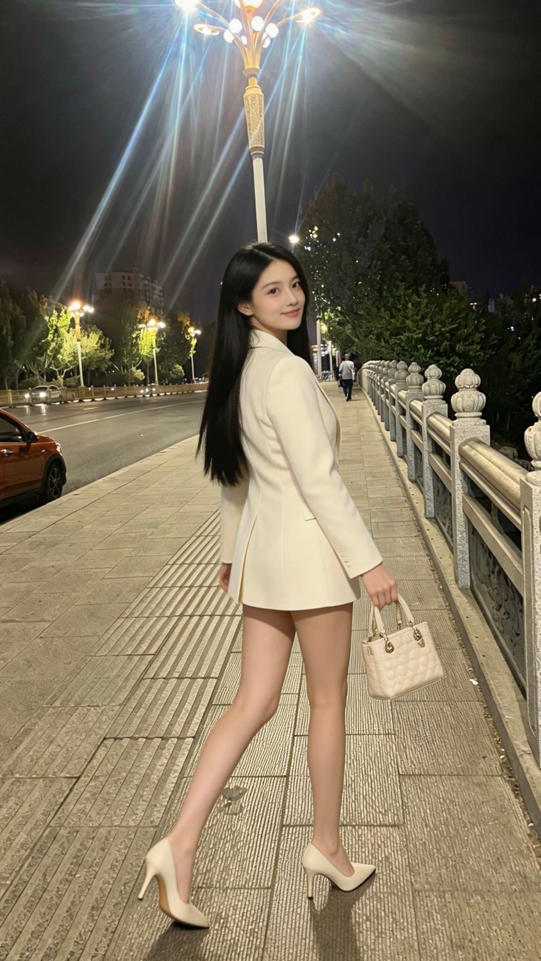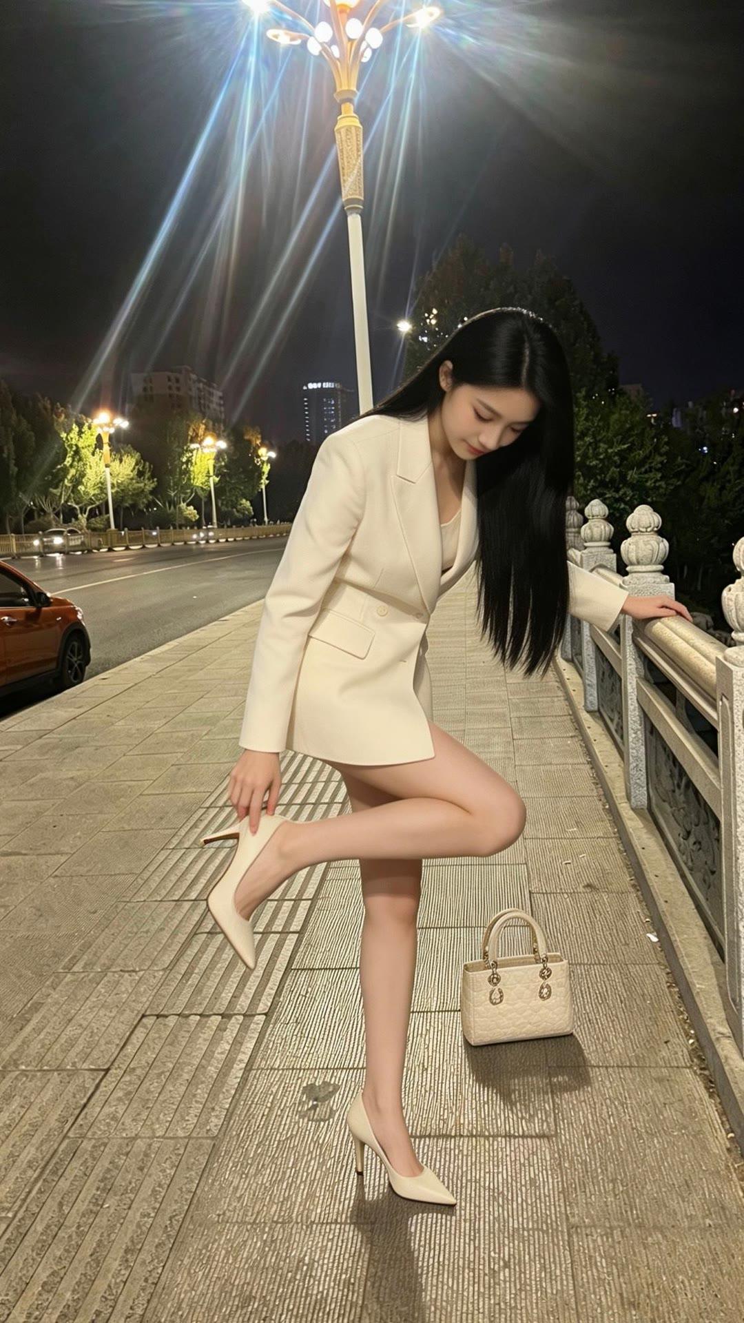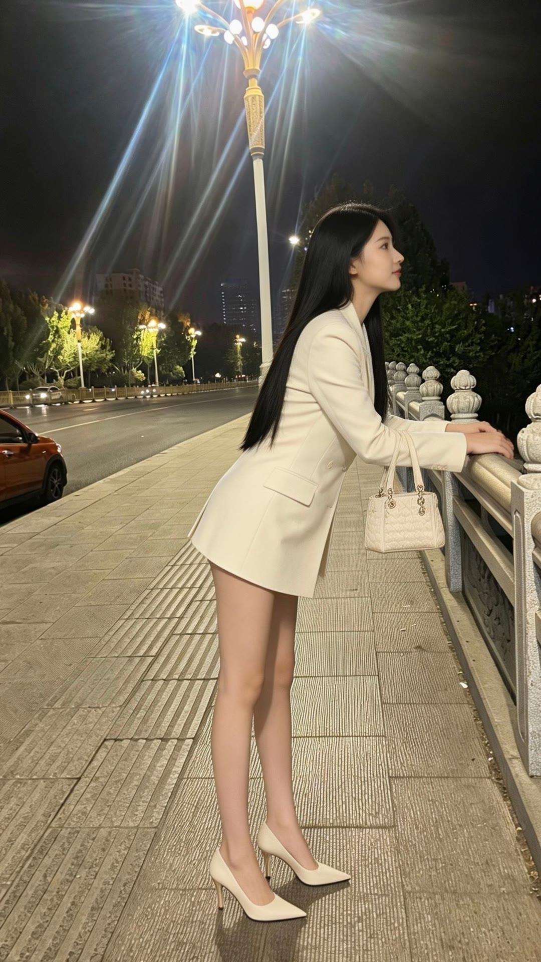 米白色收腰西装,搭配同色高跟鞋,清爽干练又精致。