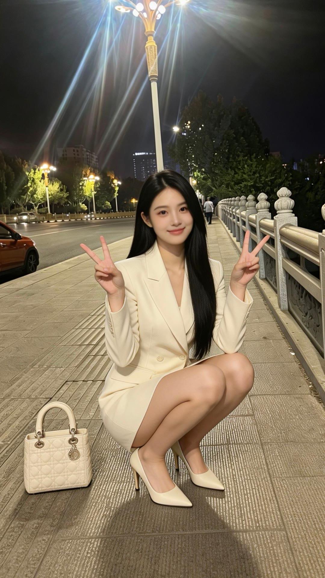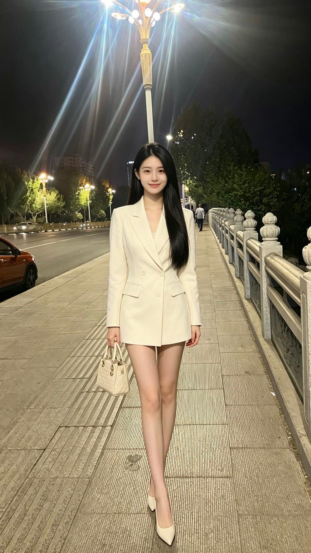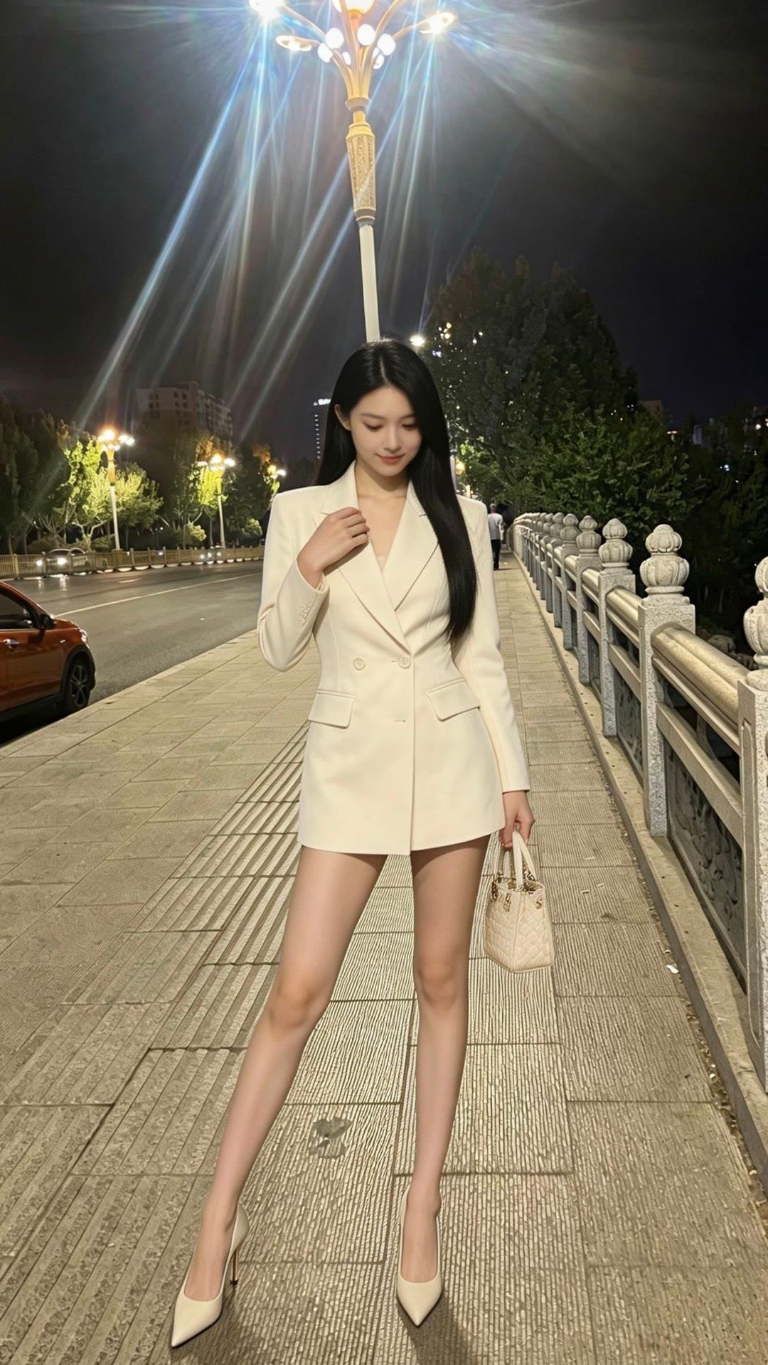 米白色收腰西装,搭配同色高跟鞋,清爽干练又精致。