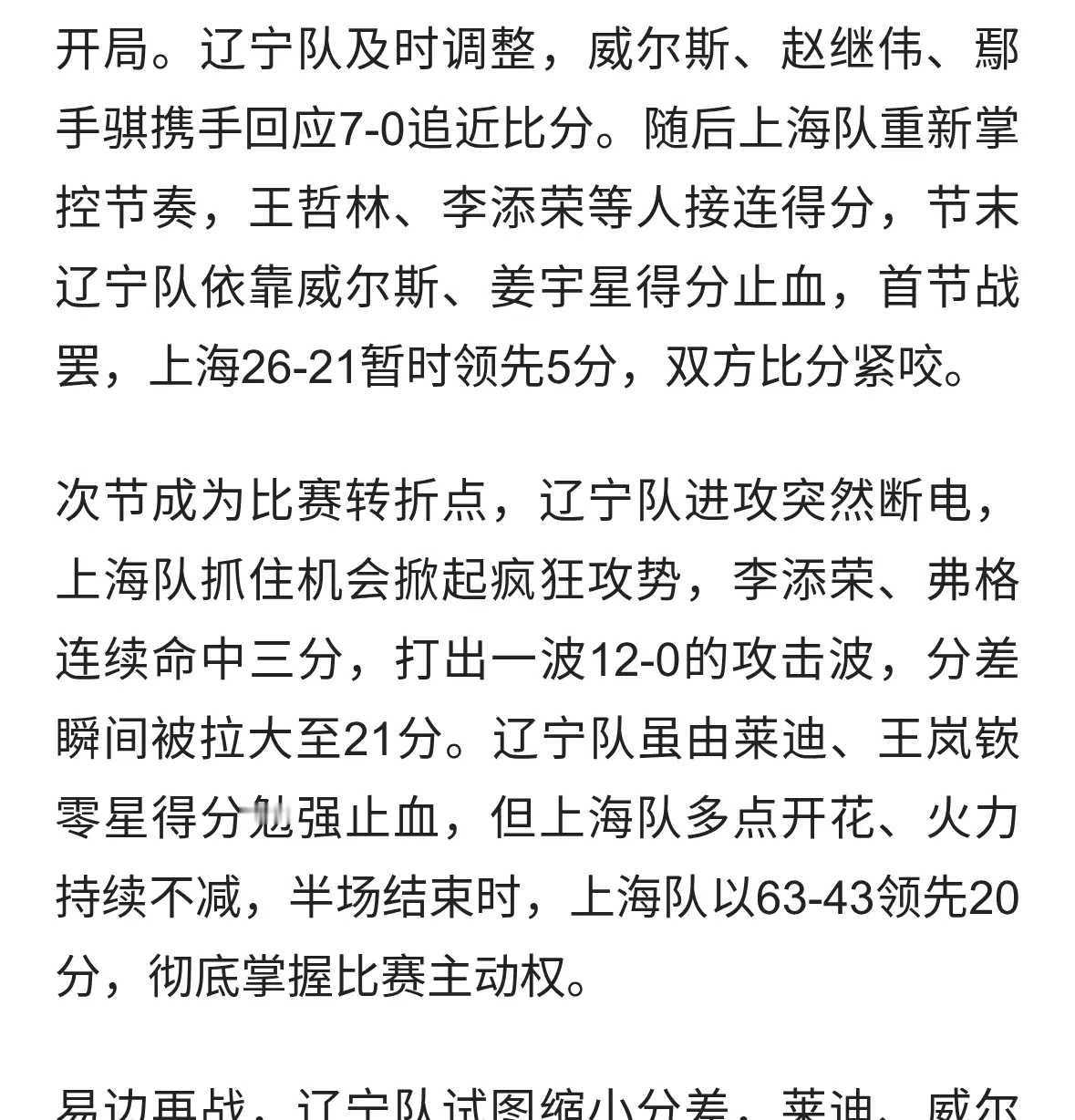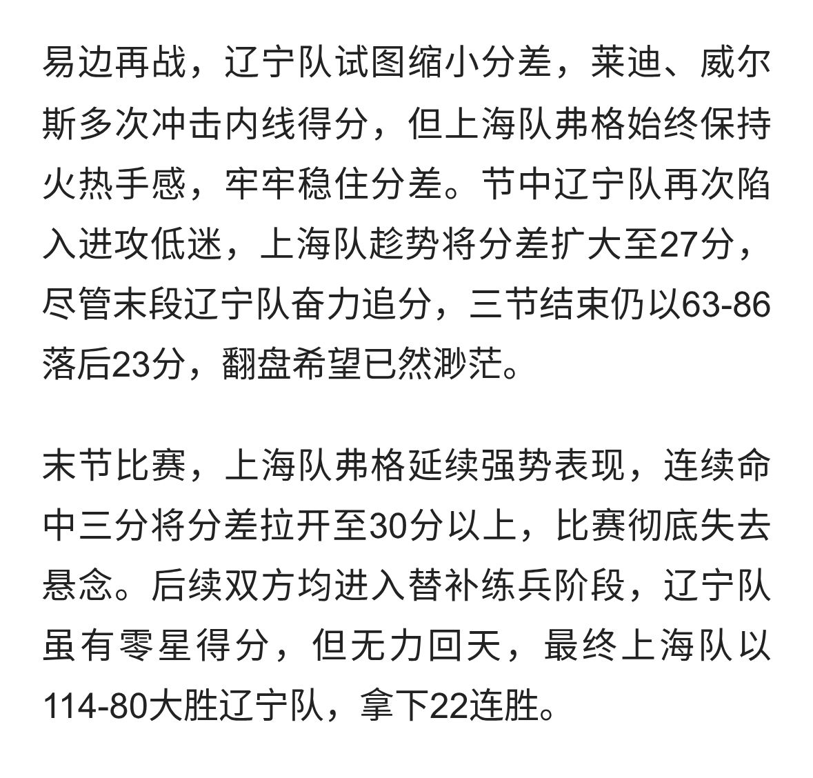 34分悬殊分差!上海豪取22连胜双杀辽宁,辽篮攻防全面崩盘
