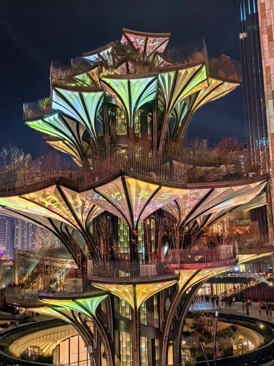 1.生命之树:以古观音禅寺千年银杏为灵感,57米高的纵向公园呈现“丝路”七大生态景观,是文商旅融合典范。