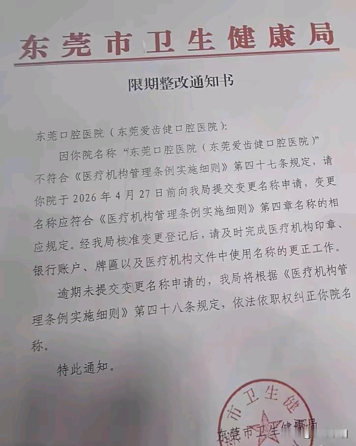 最近东莞市卫健局正式出手,勒令这家医院限期更名整改,要求4月27日前必须改名,否则将依法强制纠正。核心原因就是名字违规、容易误导群众 。
