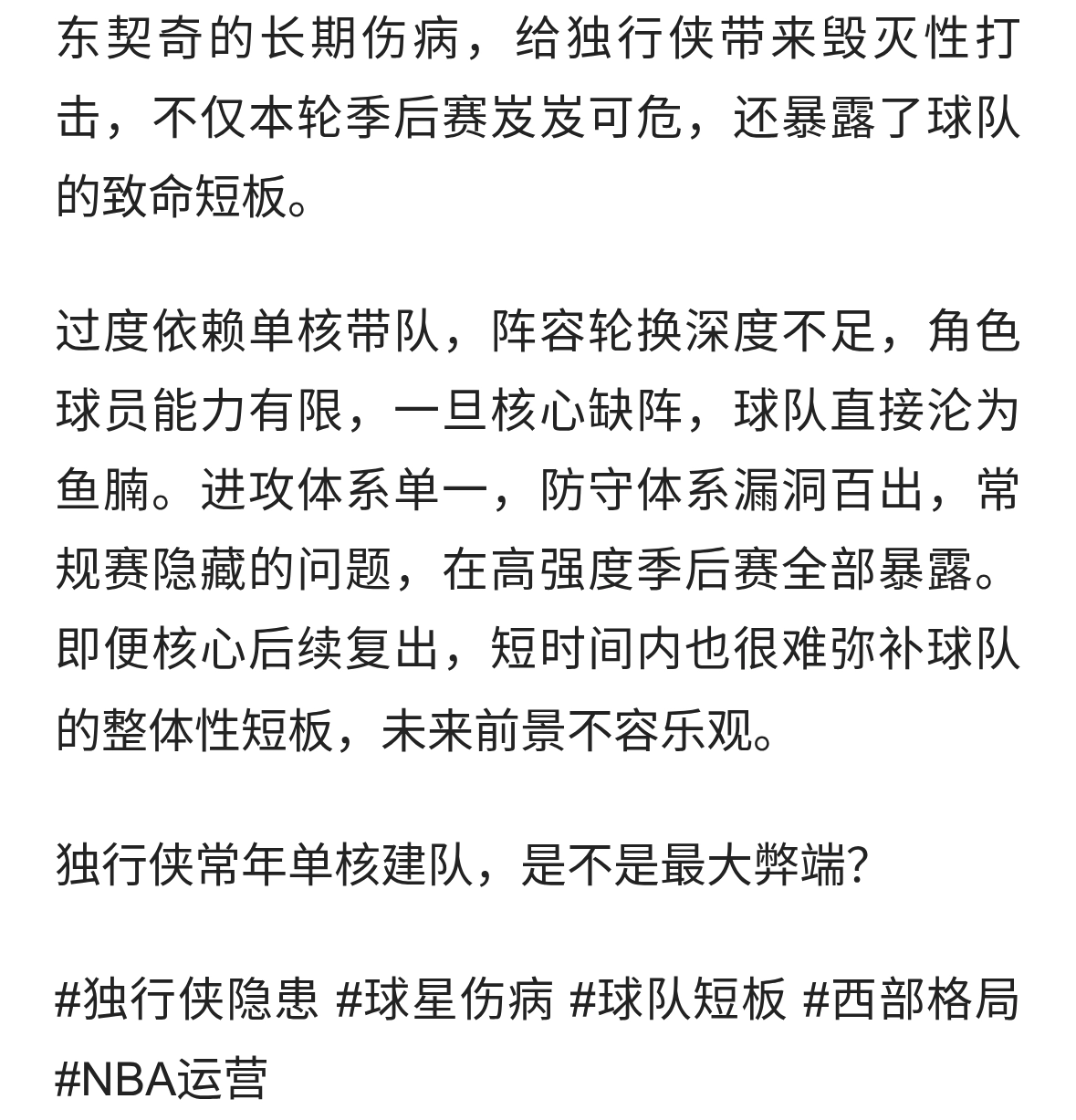 核心伤病隐患缠身 轮换残缺不全 独行侠前路一片灰暗