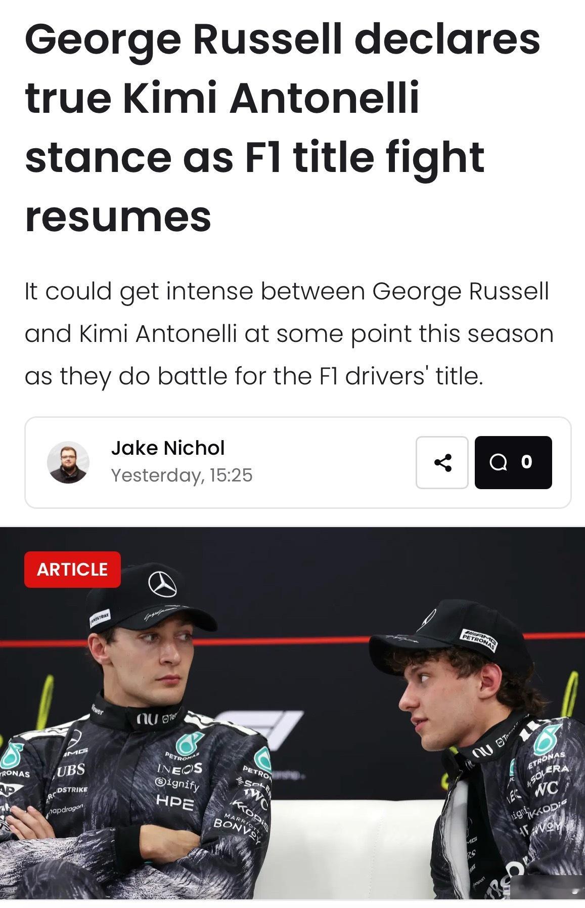 “老实说,一点也没有,”当被问及在冠军争夺战可能一触即发的情况下,他与Antonelli的关系是否发生了变化时,Russell向包括RacingNews365在内的媒体如是说道。