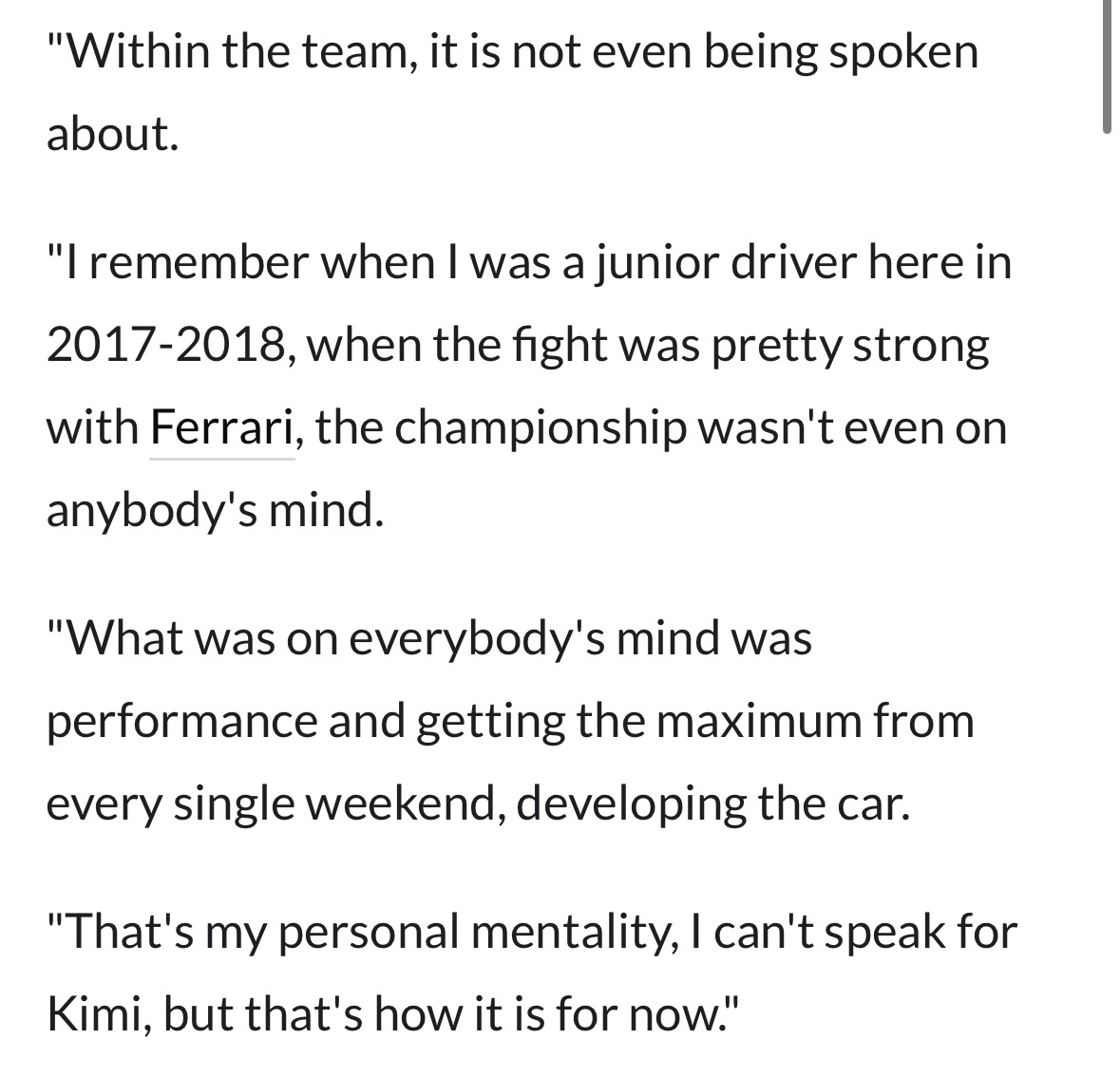 “我记得2017到2018年我还是这里的青训车手时,虽然当时与法拉利的竞争非常激烈,但大家心里甚至都没在想总冠军的事。