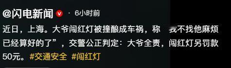 “我不找他麻烦已经算好的了。”上海大爷闯红灯被撞,交警的判罚让全网叫好