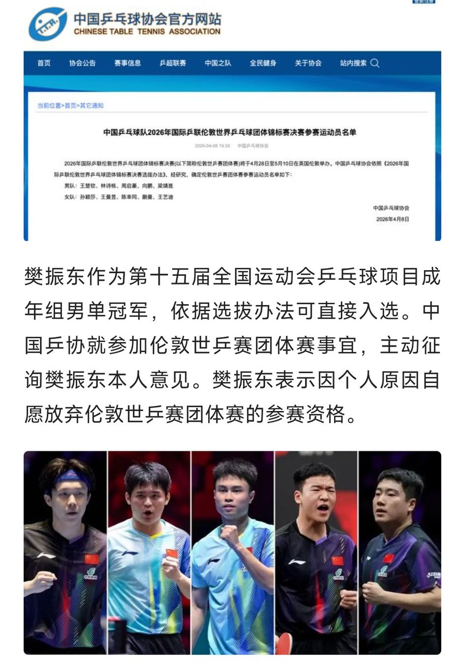 之前樊振东是否回归国家队出征伦敦世锦赛一直悬而未决,为大家所关注,参赛名单公布,樊振东榜上无名,相关报道是这样描述的。