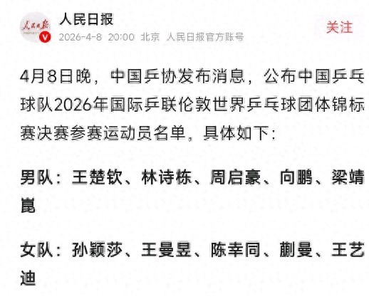 据报道,昨日中国乒协公布伦敦世锦赛团体赛国乒参赛名单。