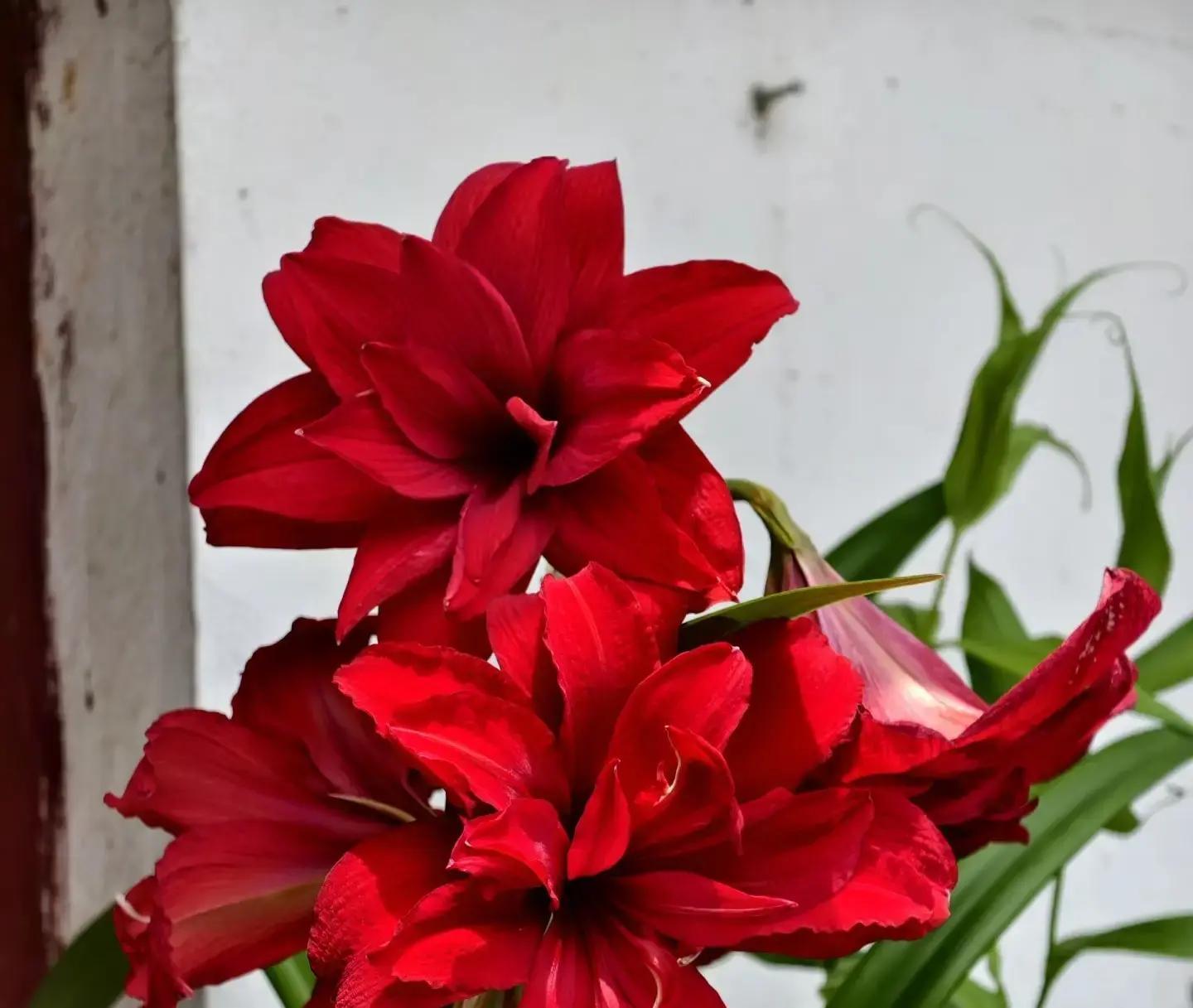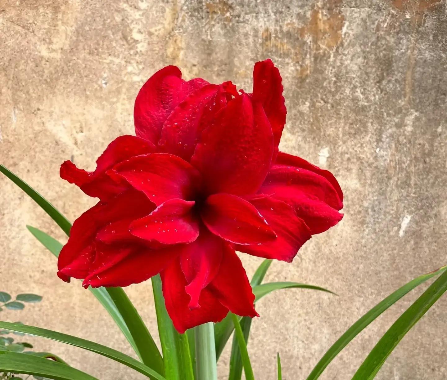 这位晒图的主人说,她养的其实是阿玛兰蒂朱顶红,养在阳台南边,阳光充足,花球表面蜡质层被去掉后叶子长得特别旺盛。阿玛兰蒂是朱顶红家族中的佼佼者,不仅叶子粗壮笔直,还能开出大而艳丽的红色重瓣花,一次开花红火得像过节。养得好还能一年两次花,堪称勤花型品种。