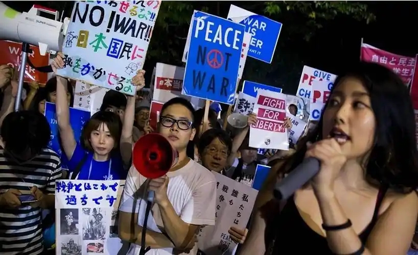大批民众聚集在首相官邸前,反对激进的军事扩张政策,但声音传不到审议的会场里。