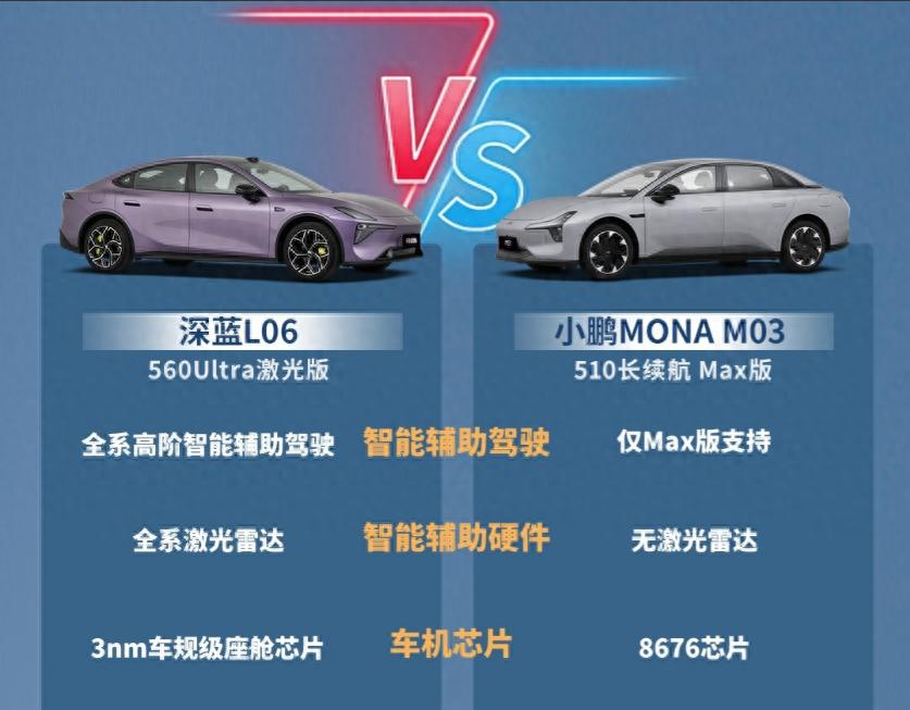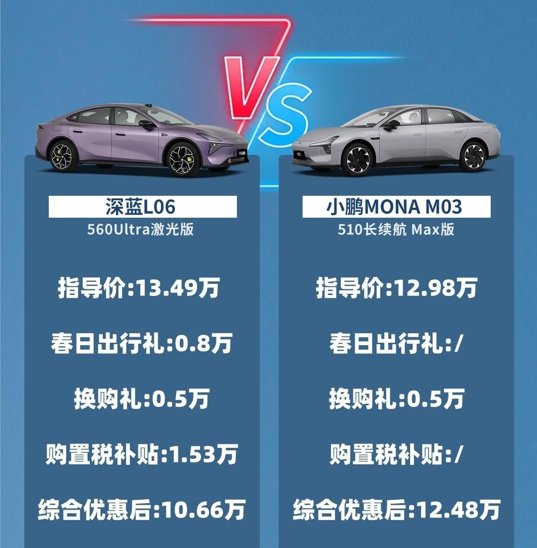最近不少朋友在 10-13 万级纯电智能轿跑里纠结,尤其是小鹏 MONA M03 刚改款上新,很多人拿它和深蓝 L06比,到底谁更值、谁更能打?今天就不绕弯子,以小鹏MONA M03 510max版和深蓝L06 560Ultra版举例,从大家最关心的智能、续航、底盘、空间这几个核心点,结合日常通勤、长途出行、复杂泊车这些真实用车场景,和大家聊聊两款热门车型,不吹不黑,给正在选车的朋友一个实在参考。