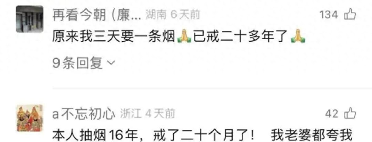 这一事件触动了不少人的神经,评论区中,有网友讲述自己或身边人因吸烟患癌的痛苦故事,也有吸烟者家属无奈“多次劝说未见效果”的吐槽。与此同时,成功戒烟的网友则分享了自己的坚持,并收获了身边人的认可和鼓励。