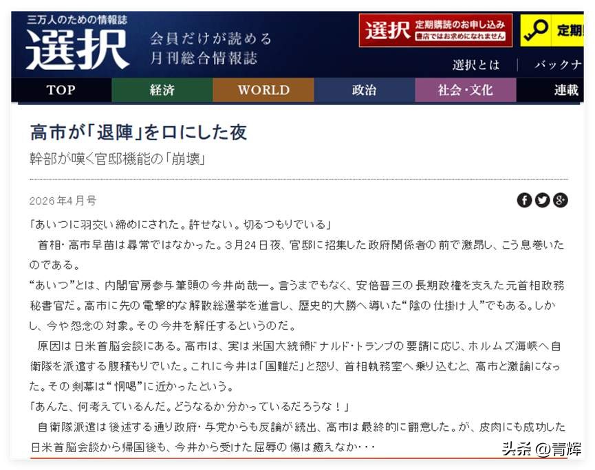4月2号当天晚上,根据我国环球时报媒体发布的一则消息可以得知,日本国内的一家名为选择的杂志对外披露了一则关于日本现任首相高市早苗的劲爆消息——这位女首相近期惨遭逼宫,被下属当场质问和斥责。
