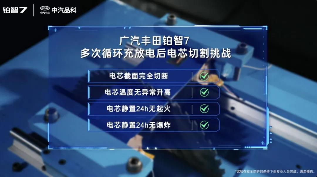 近日,中汽中心曾对一块经过了800多次循环充放电、等效行驶里程超30万公里的铂智7电池电芯进行“全截面切割”测试,最终被切割的电芯温度无异常升高,静置24小时后无起火、无爆炸。