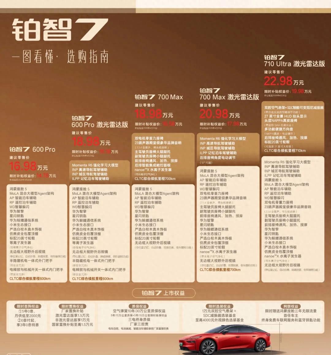 权益后,铂智7的售价为14.78-19.98万元,顶配比预售时的置换权益价直降1万元。