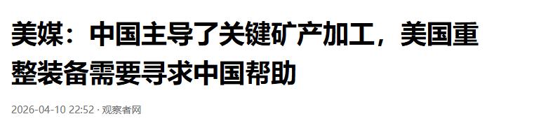 近日,美媒公开披露,在支撑雷达、导弹等高端武器制造的关键矿产加工环节,中国已处于全球绝对主导位置,美国装备补给与国防工业正常运转,根本绕不开与中方的供应链对接。