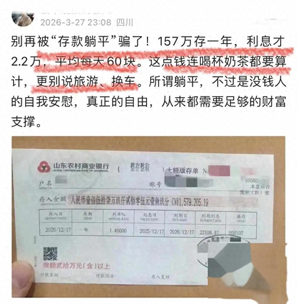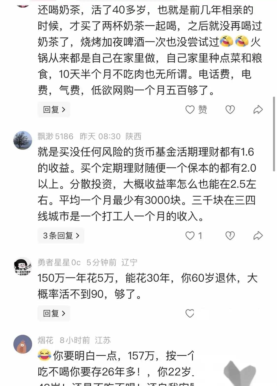 四川网友把157万存银行,一年下来利息2万出头,折合每天60块,这还真不是段子。有人会觉得,157万不算少了吧,按理说日子应该挺滋润,结果冷冰冰的数字啪啪打脸。
