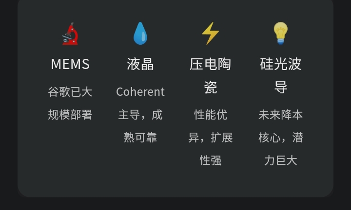 全光交换并非单一技术,而是MEMS、液晶、压电陶瓷、硅光波导四大路线并行的赛道。谷歌主导的MEMS方案已大规模部署,而硅光波导被视为未来降本增效的关键。