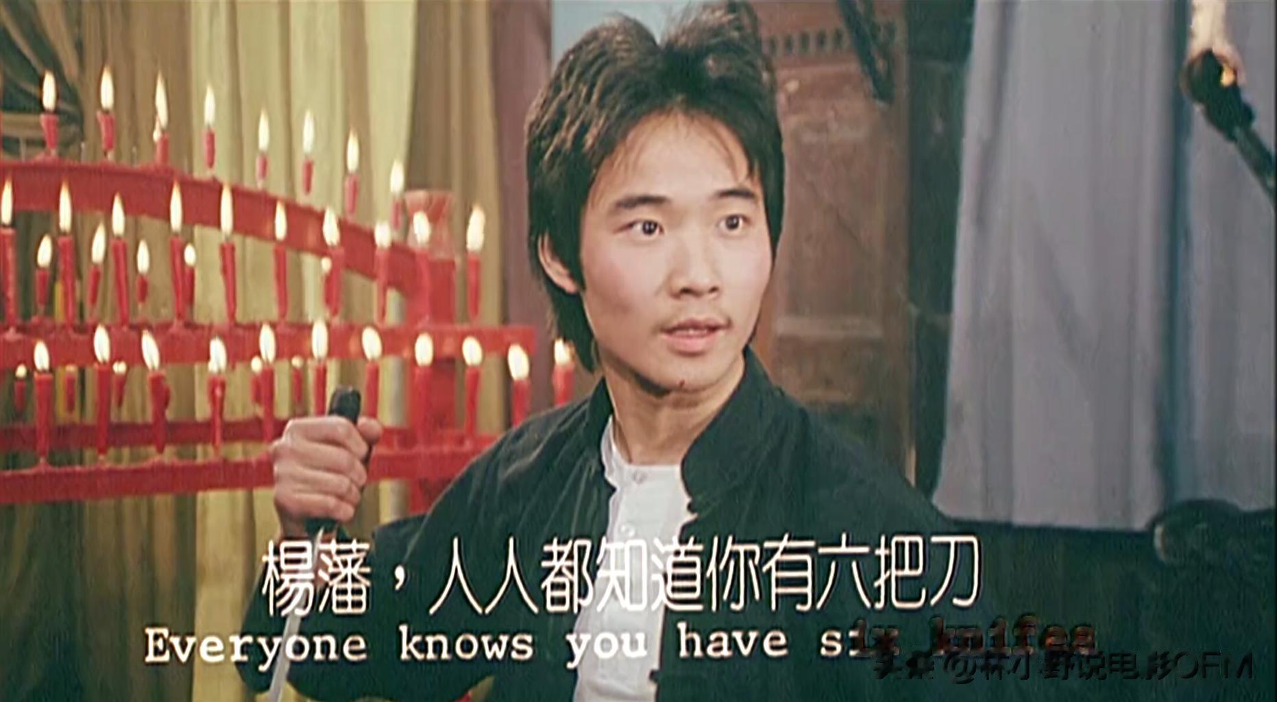 小编头脑里印象最深的是最后一场戏,在香堂里有一个打手说,“小刀杨藩,人人都知道你只有六把刀,现在你没有刀了……”话还没说完,就被杨藩一旗杆给刺死了!