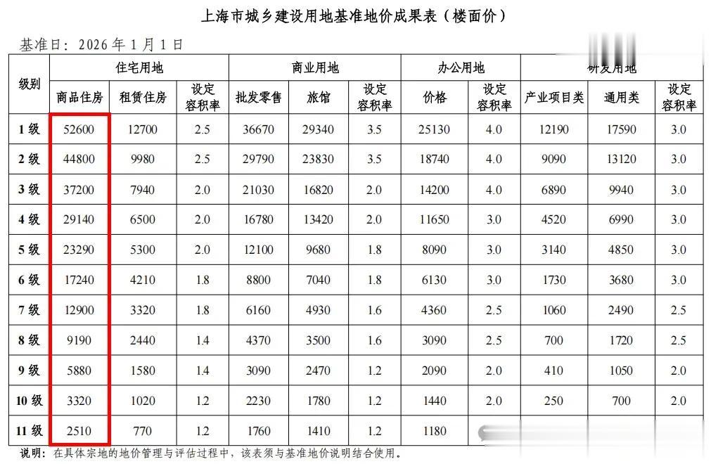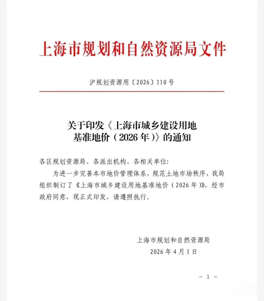 2026年4月1日,《上海市城乡建设用地基准地价(2026年)》正式发布,此次公布的基准地价与2020年1月1日的版本相比,核心区域商品住宅土地价格,全面上涨。