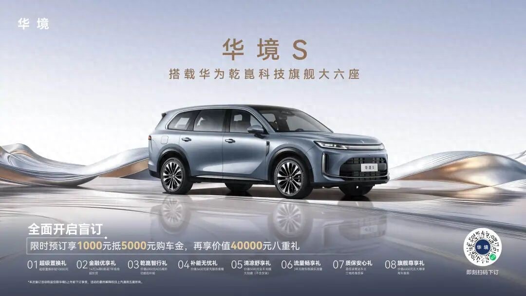 预订正式开启,全国华境体验中心陆续点亮华境S领航科技品鉴会现场,新车正式开启全国预订。用户可通过华境汽车小程序、华境汽车抖音、华为乾崑APP等官方通道下订。限时下订可享受 1000 元抵 5000 元购车金,更可叠加价值40000元的八重专属礼遇。伴随产品发布,华境S首批 158 家体验中心已整装待发,强势覆盖全国131城,更多门店正持续点亮,以专业、贴心、高效的服务全程陪伴。