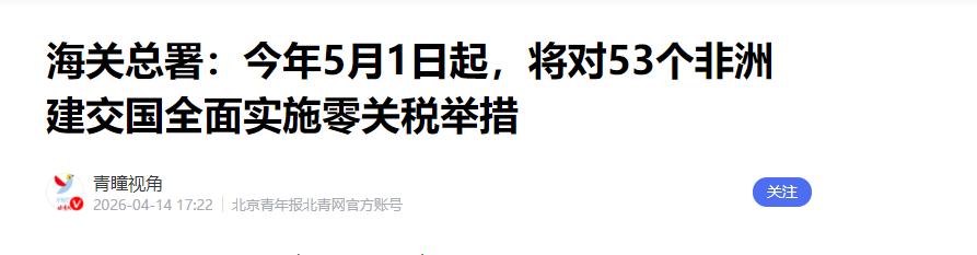 2026年5月,大陆对非洲53个建交国全面实施100%税目产品零关税,唯独斯威士兰不在内。