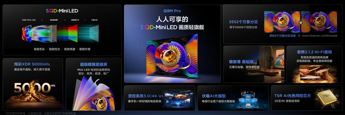 Q9M Pro搭载的SQD-Mini LED技术,是真正的一灯一分区,其中98吋版本拥有3552个万象分区,相当于市面上10656个控色分区,控光精准度翻倍,所以劝你多想一步,研究下数值背后的意义才靠得住。