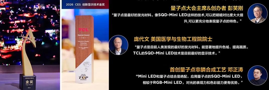 早前国际消费电子展CES 2026上,SQD-Mini LED技术斩获创新显示技术金奖,更被众多科技媒体评选为“BEST OF 2026CES”。放眼国内的AWE 2026上,搭载该技术的TCL X11L电视再获艾普兰奖金奖,海内外媒体高度评价,行业专家更是赞不绝口,足以见证SQD-Mini LED的硬核实力。而TCL作为Mini LED宗师,更是把这项技术做到了普惠,让Q9M Pro成为人人都能买得起的好画质款。