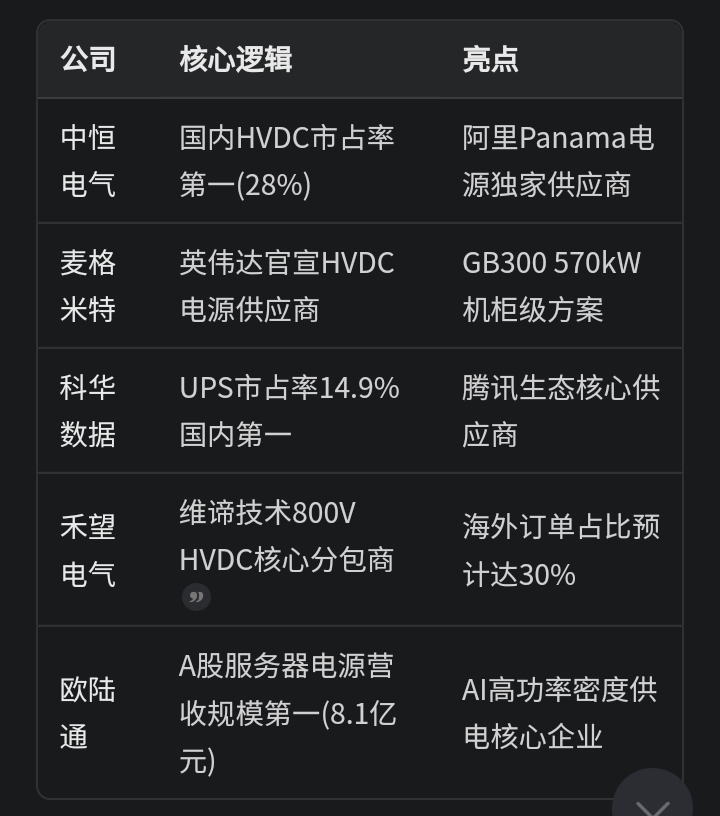 中恒电气002364:国内HVDC电源绝对龙头,市占率28%排名第一。独家供应阿里"巴拿马电源",800V架构适配英伟达整机柜。2024年净利润同比增长154%-217%,海外业务毛利率达40.3%。公司深度参与下一代数据中心供电架构研发,是AI算力电力心脏的核心供应商。