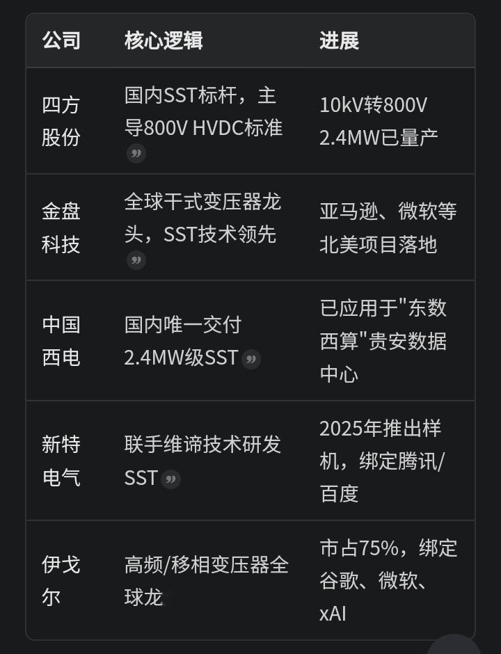 麦格米特002851:A股唯一被英伟达官宣的HVDC电源供应商,为GB300服务器打造570kW机柜级方案,模块化电源转换效率高达99%。2025年上半年净利润同比增长1005%,欧洲ACC项目顺利通过验收。公司近期发布HVDC 800V DC Side-car整体解决方案,从服务器电源向电源整体解决方案升级。金盘科技688676:全球干式变压器龙头,自研SST技术已应用于亚马逊、微软等北美数据中心项目。公司已完成固态变压器(SST)样机的设计及生产,2025年订单饱满并已开始排产2026年。在HVDC、固态变压器等前沿技术领域持续投入研发,是SST稀缺标的。