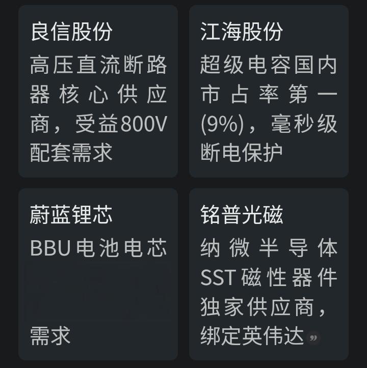 细分领域三:核心零部件HVDC产业链上游包括固态断路器、超级电容、磁性材料等核心零部件。随着800V架构普及,这些"卖铲人"将迎来确定性增长
