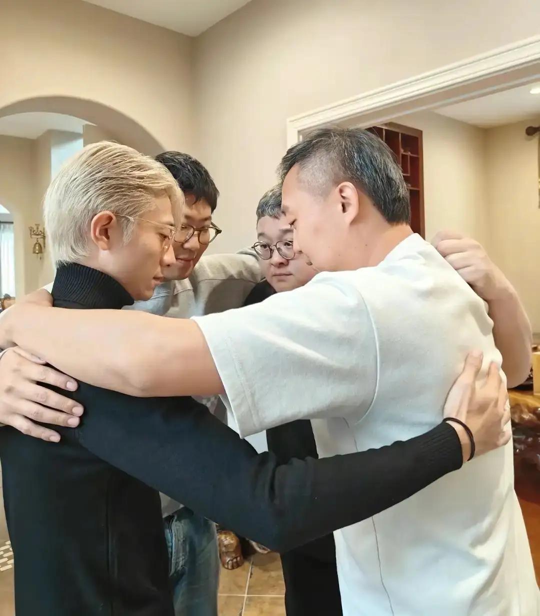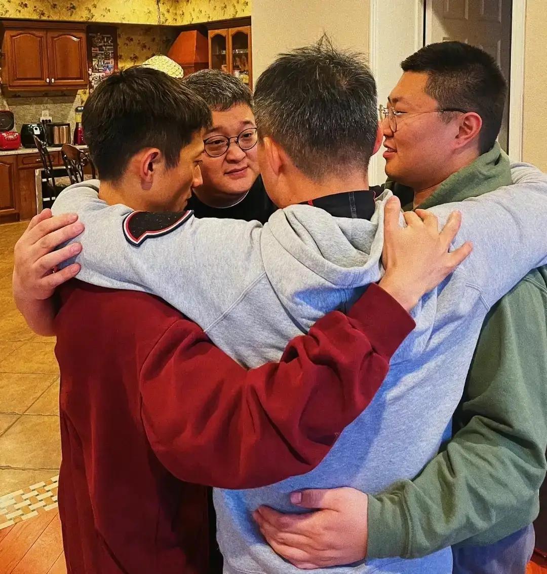 他们吃完饭抱在一起合影,跟小时候一模一样。只不过当年的小屁孩,现在都长成了大人,有的成了知名演员,有的成了导演,唯一没变的是凑在一起就有说不完的话。