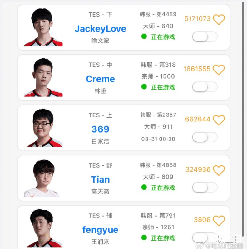 更扎眼的是——全队都在rank,唯独369没有。有人翻出韩服战绩,Tian、JackeyLove、Creme、JiaQi都在排位,唯独369的账号一片沉寂。