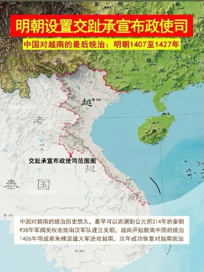 公元939年,吴权在白藤江击败南汉军队,越南开始独立建国。但此后仍长期向中国朝贡,保持藩属关系 。1407年,明朝一度直接统治越南,设交趾布政使司,但20年后因当地反抗激烈而撤军 。