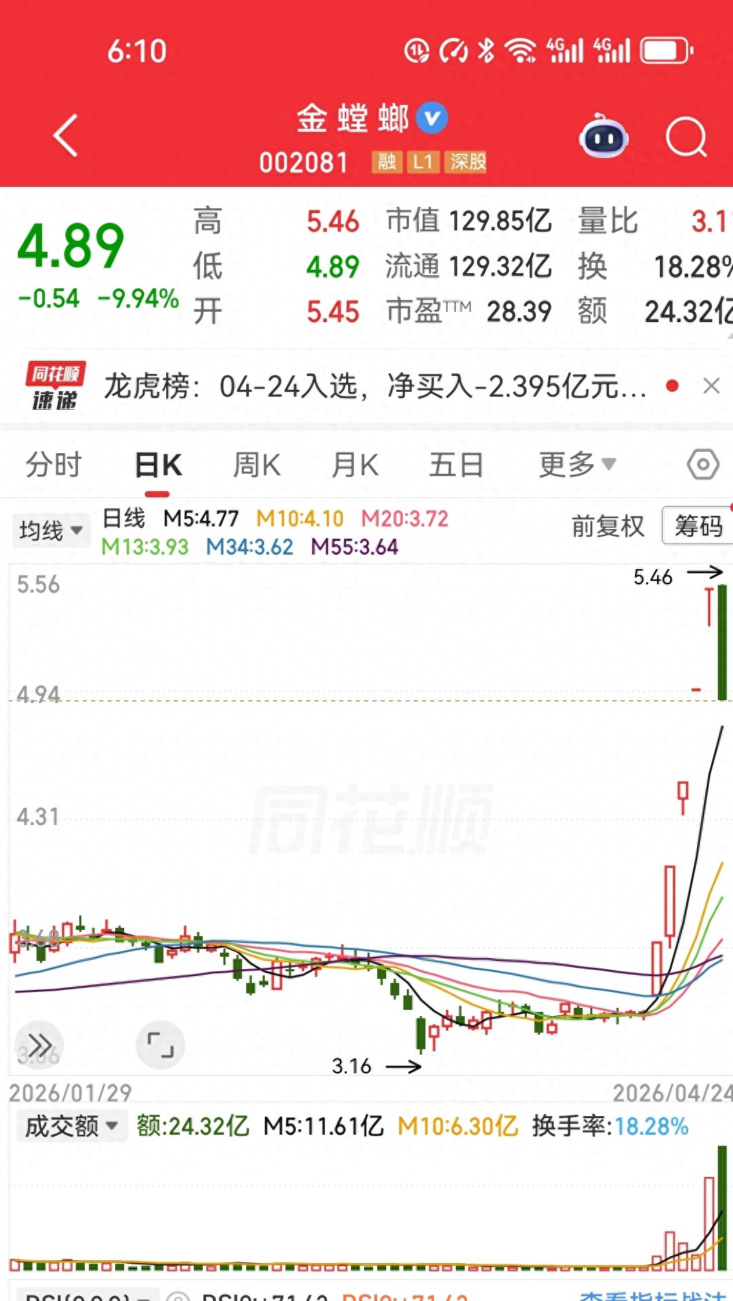 一位朋友4月23号,他把金螳螂5000股给出了,成交价5.43元。而这一批货,是4月17号打板进去的,当时一口气买进1万股,成本3.71元。