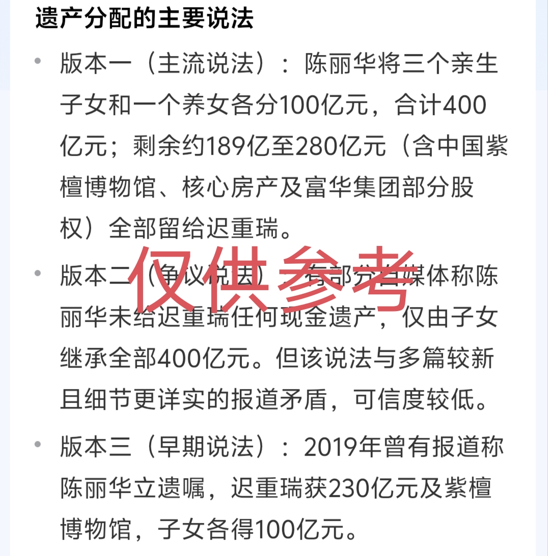 版本三:子女各100亿,迟重瑞230亿加紫檀博物馆。这个版本是很早以前的说法。