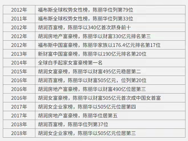 2018年,陈丽华在胡润女企业家榜排名第三,身价505亿元。