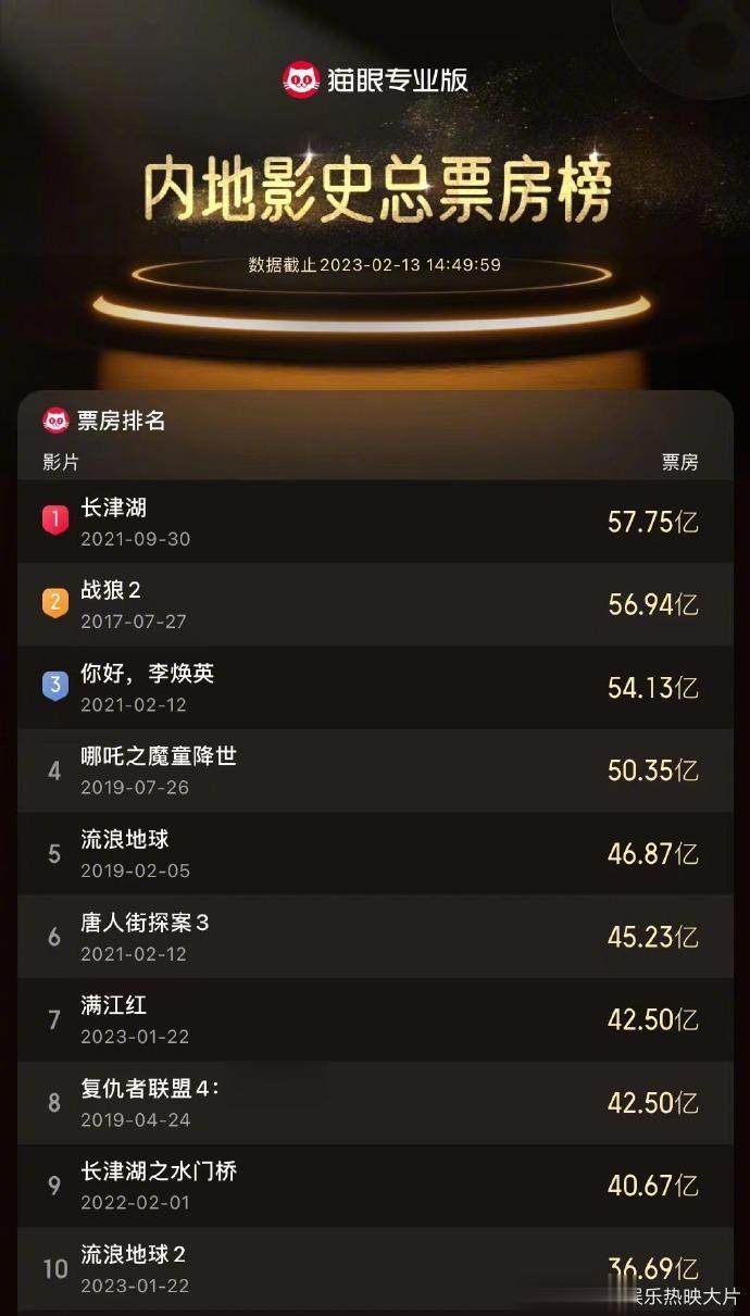 #满江红成中国影史票房榜第7名#据猫眼专业版数据,《满江红》累计票房突破42.