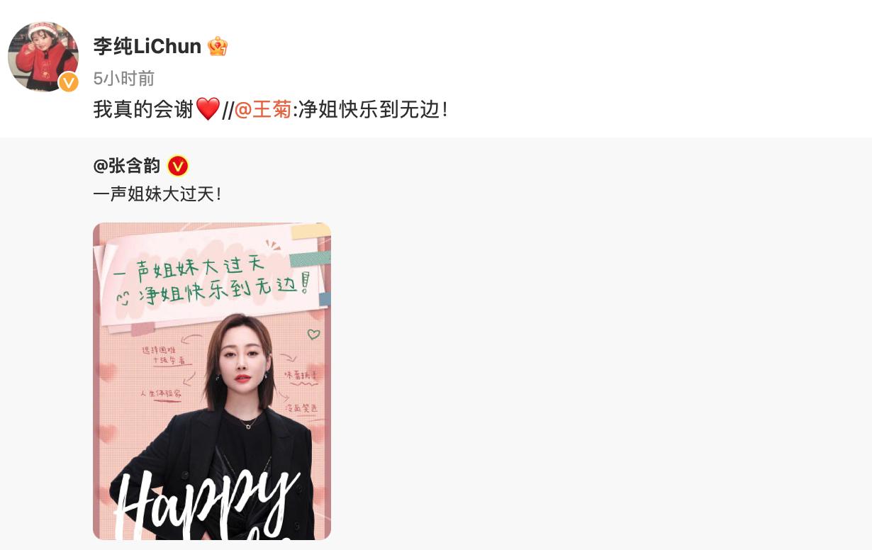 #张含韵王菊为美味姐妹李纯庆生# 2月15日,是34岁的生日,与其共同主演剧版及电影版《爱很美味》的演员晒出李纯可爱风土味庆生海报,并发文:“一声姐妹大过天!”同剧另一位主演转发此文并留言:“净姐快乐到无边!”李纯收到祝福后搞笑回复:“我真的会谢❤️”。对于三人有爱真实地互动,网友留言感叹:“三姐妹感情真好!”