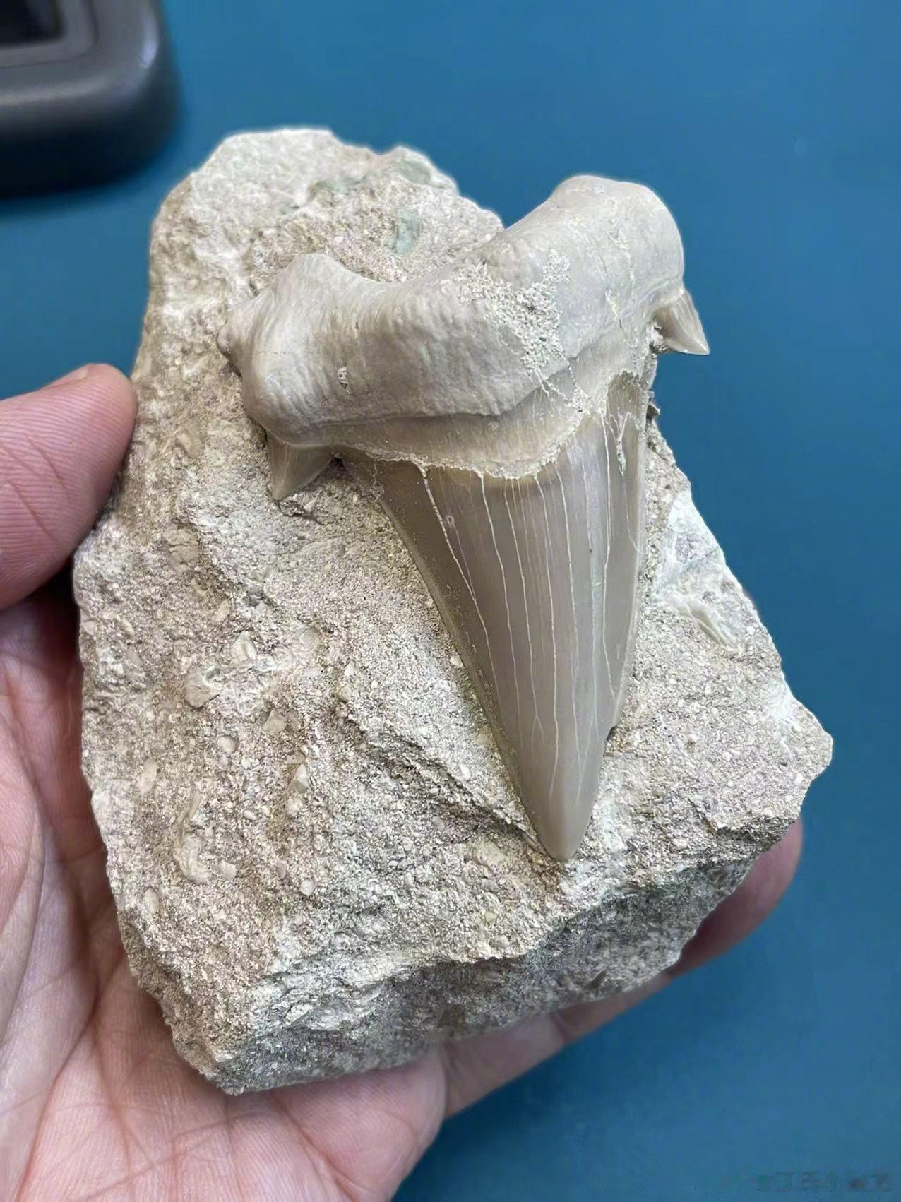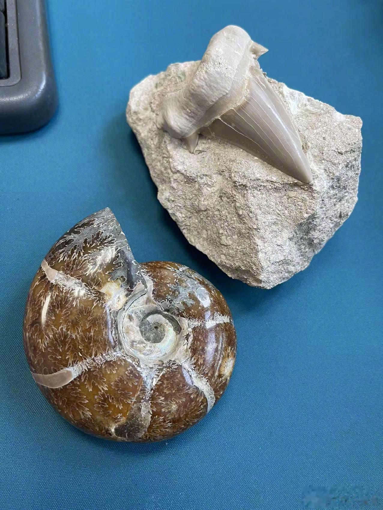 今天上新一枚刚到的大耳齿鲨牙齿化石,测长足8,保存在海相围岩之中。另一个化石则是漂亮的带菊石,并不是常见的叶菊石哦。店里还有更多古生物化石,欢迎来逛逛!
