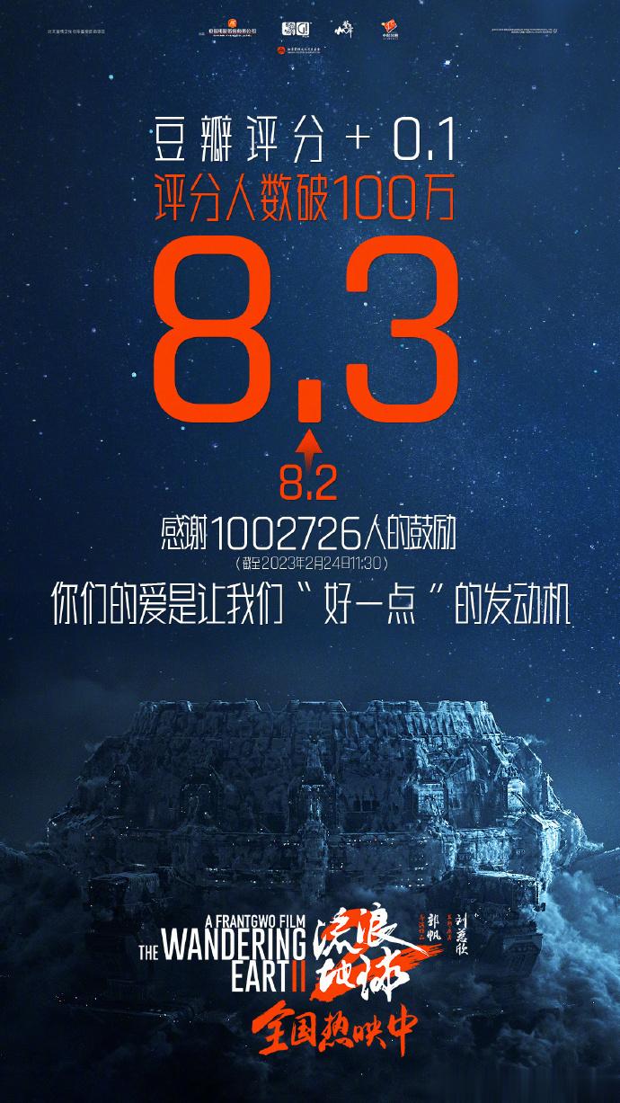#流浪地球2评分上涨#电影《流浪地球2》上映34天,豆瓣评分由8.2涨至8.3,评分人数已破100万。 [彩虹屁][彩虹屁]