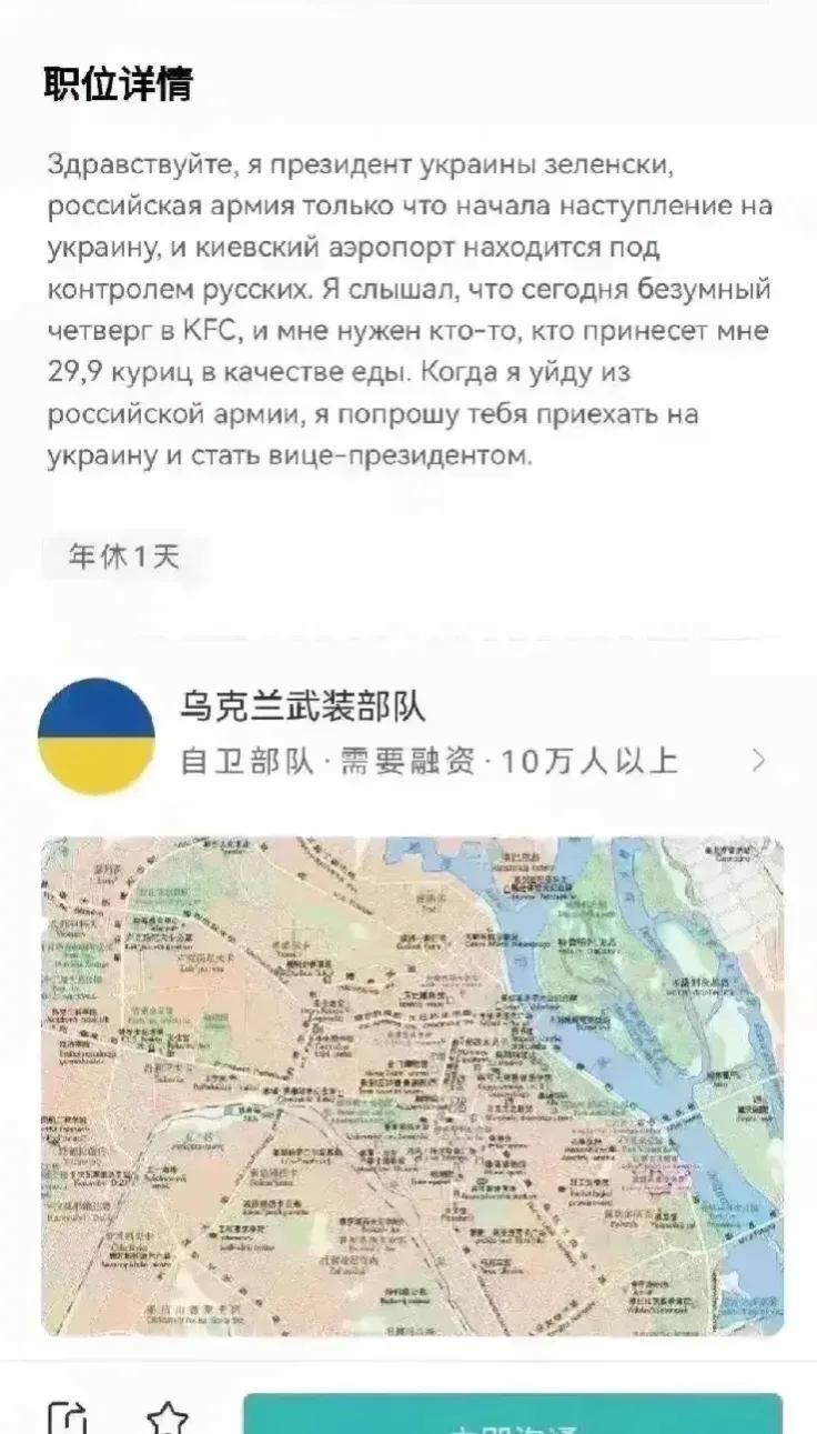 刘博士,好消息!特大好消息! 赶紧打包去乌克兰,现在就去!好事来了,一般人我不告诉他!乌克兰现在在某直聘网站上开始招兵源了,待遇相当好!年薪80-100万元,还有提成呢,根据杀敌的数量来计算,不过也有一些硬性要求的,比如一年只能够休息一天,工资干够一个月才能结算,中途退出当月工资没收,另外还要懂得一些AK-47的操作方法,你是军事砖家,应该问题不大! 快,赶紧出发吧,去晚了赶不上32路公交了!
